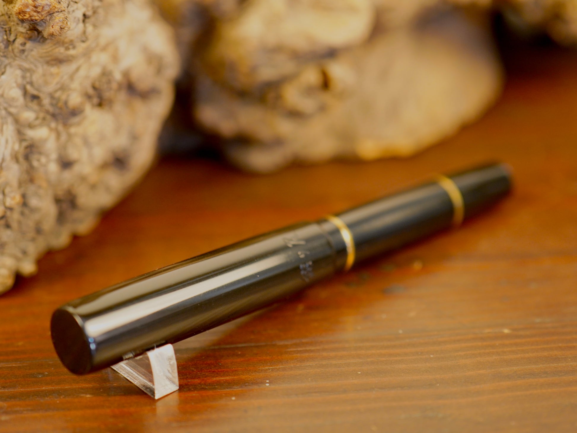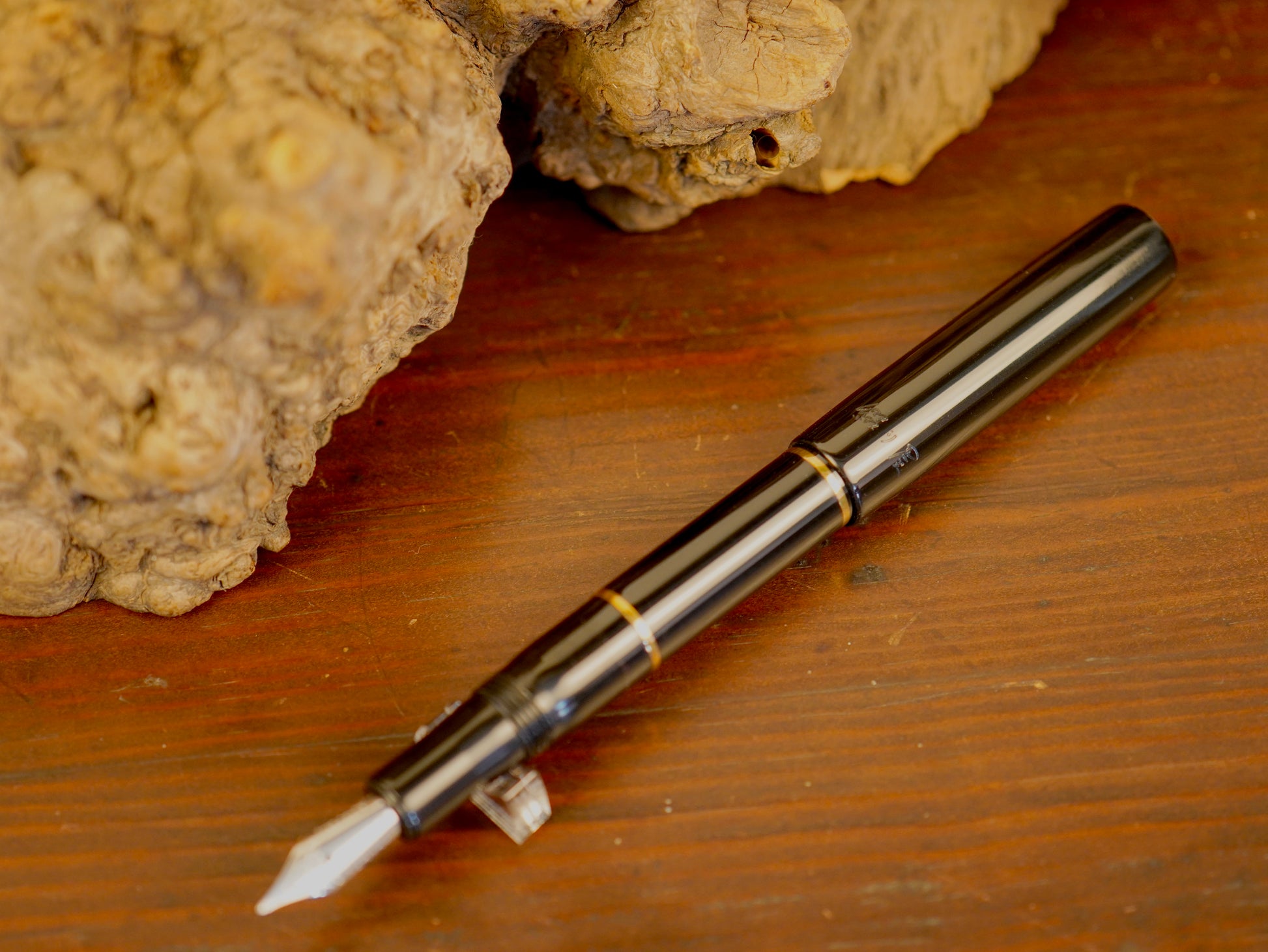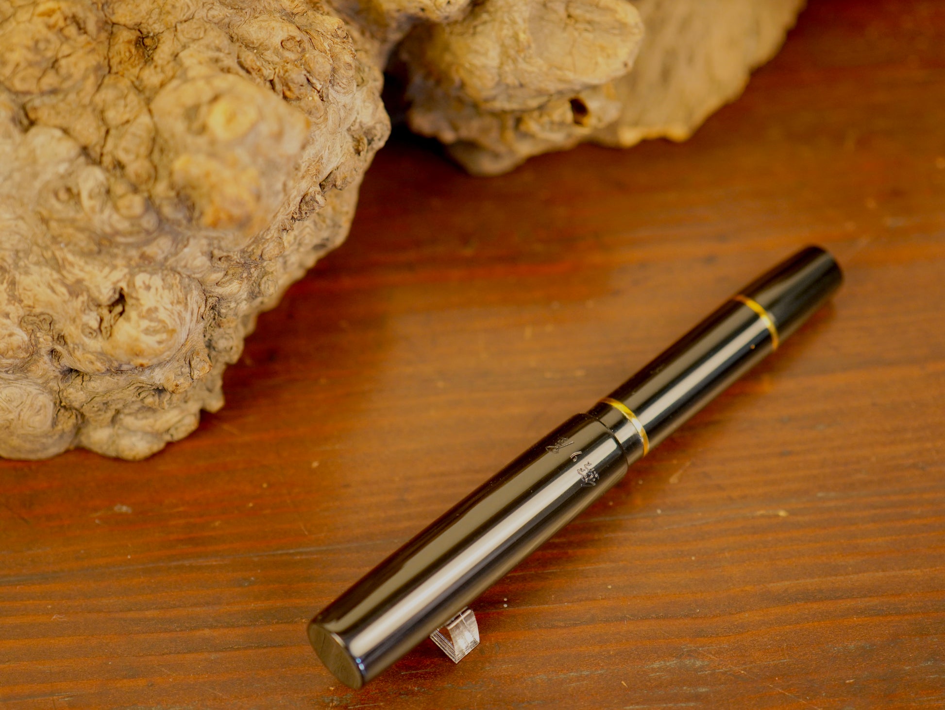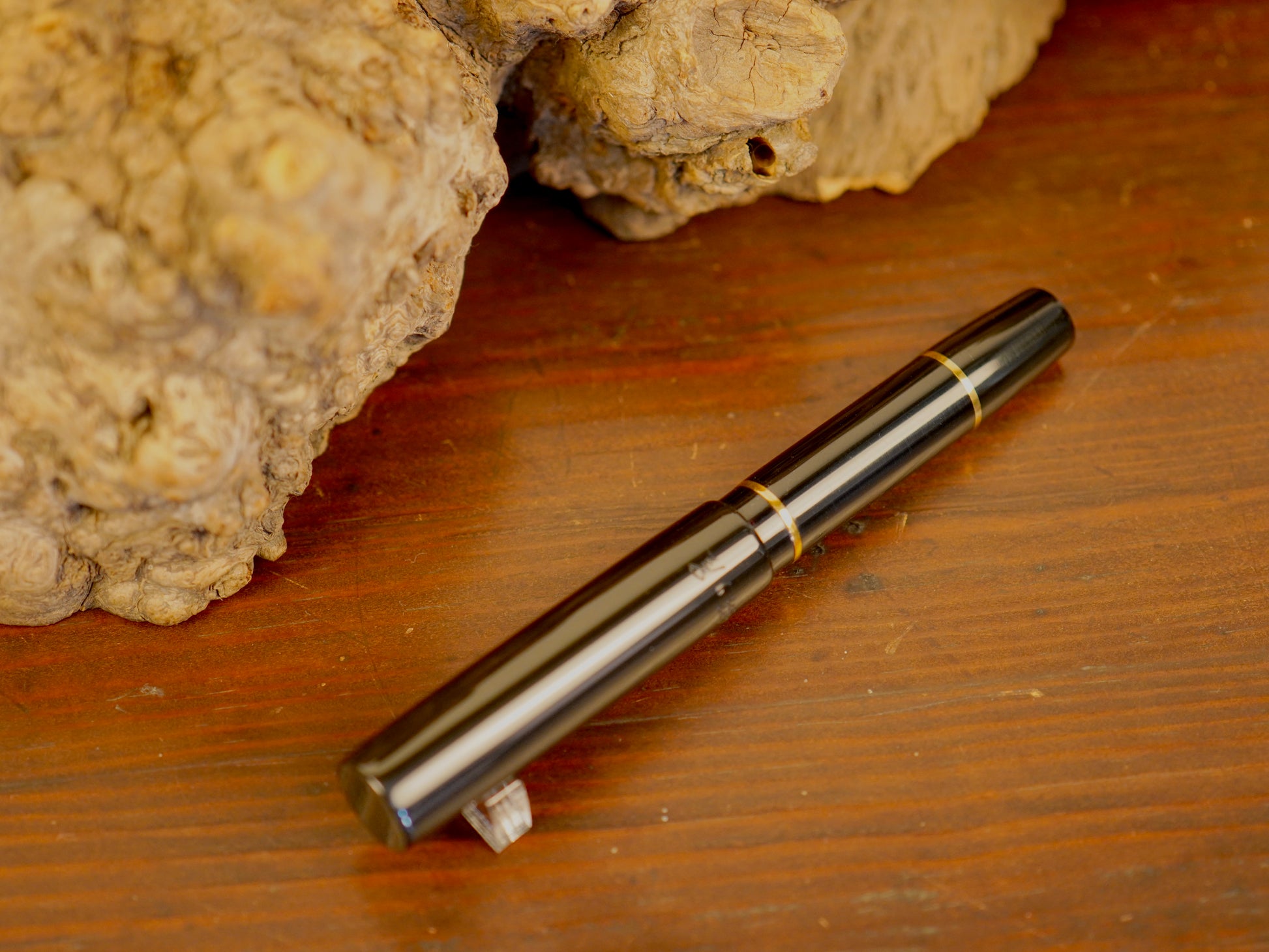 ブラックの部分はエボナイトを使用しております。エボナイトは1839年にグットイヤーが発明した半天然樹脂で、黒檀(エボニー)に似た外観からエボナイトと名付けられました。プラスチックではなく、天然ゴムの「硬質ゴム」に分類されます。エボナイトの優しい手触りは、人肌で冷たすぎず指に馴染む感触で、温かみのある触感が感じられます。変色対策として、カーボンを混入していただいています。