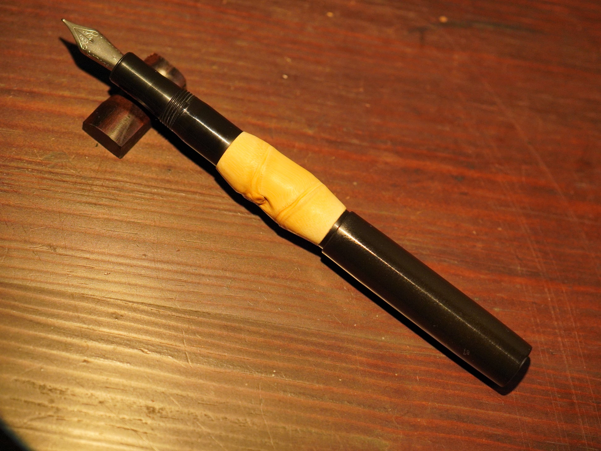 ブラックの部分はエボナイトを使用しております。エボナイトは1839年にグットイヤーが発明した半天然樹脂で、黒檀(エボニー)に似た外観からエボナイトと名付けられました。プラスチックではなく、天然ゴムの「硬質ゴム」に分類されます。エボナイトの優しい手触りは、人肌で冷たすぎず指に馴染む感触で、温かみのある触感が感じられます。変色対策として、カーボンを混入していただいています。