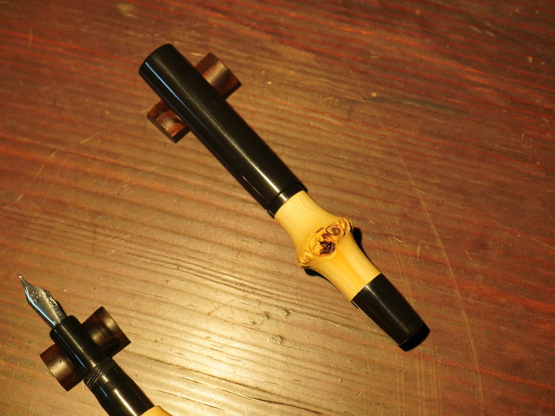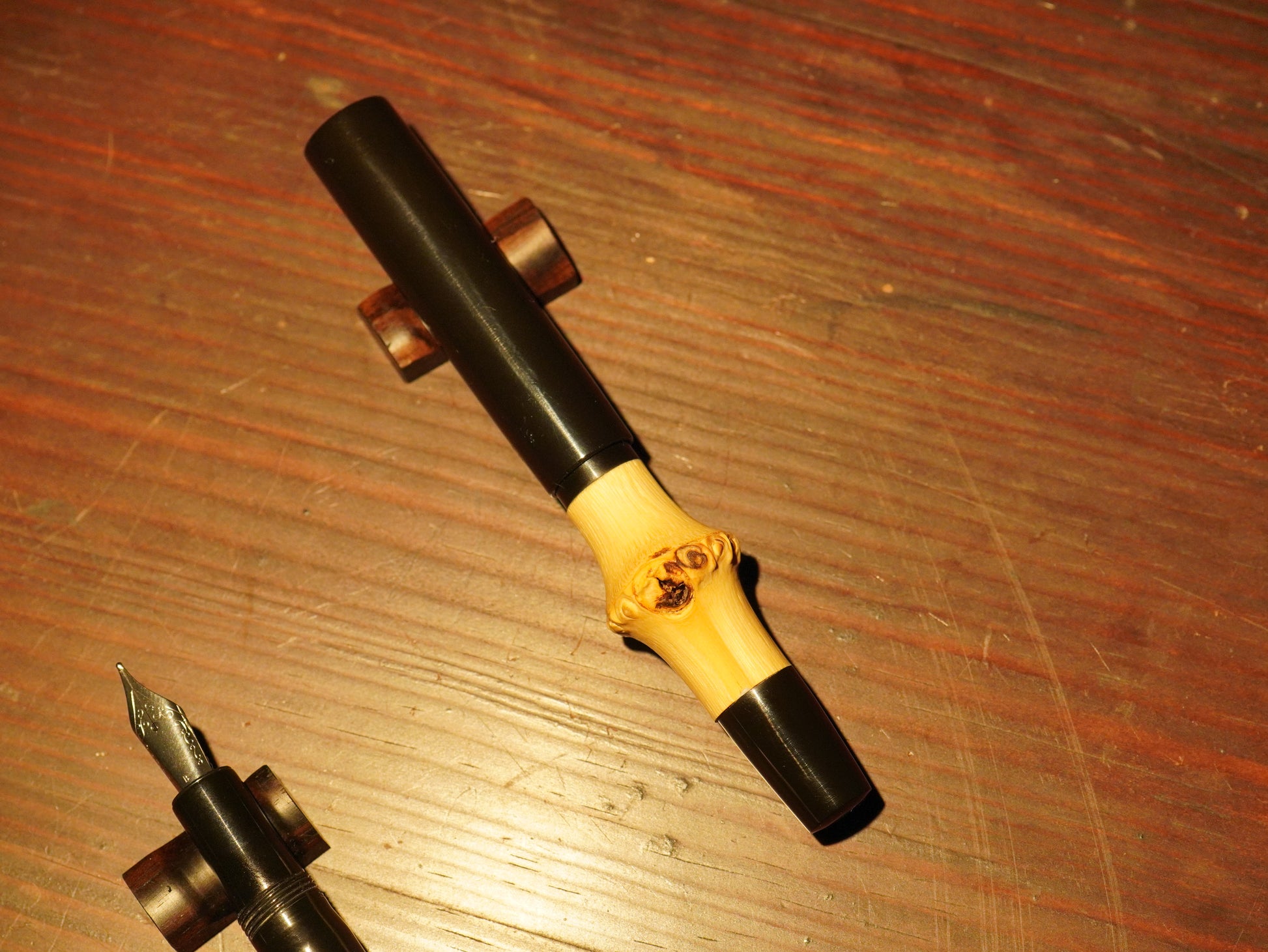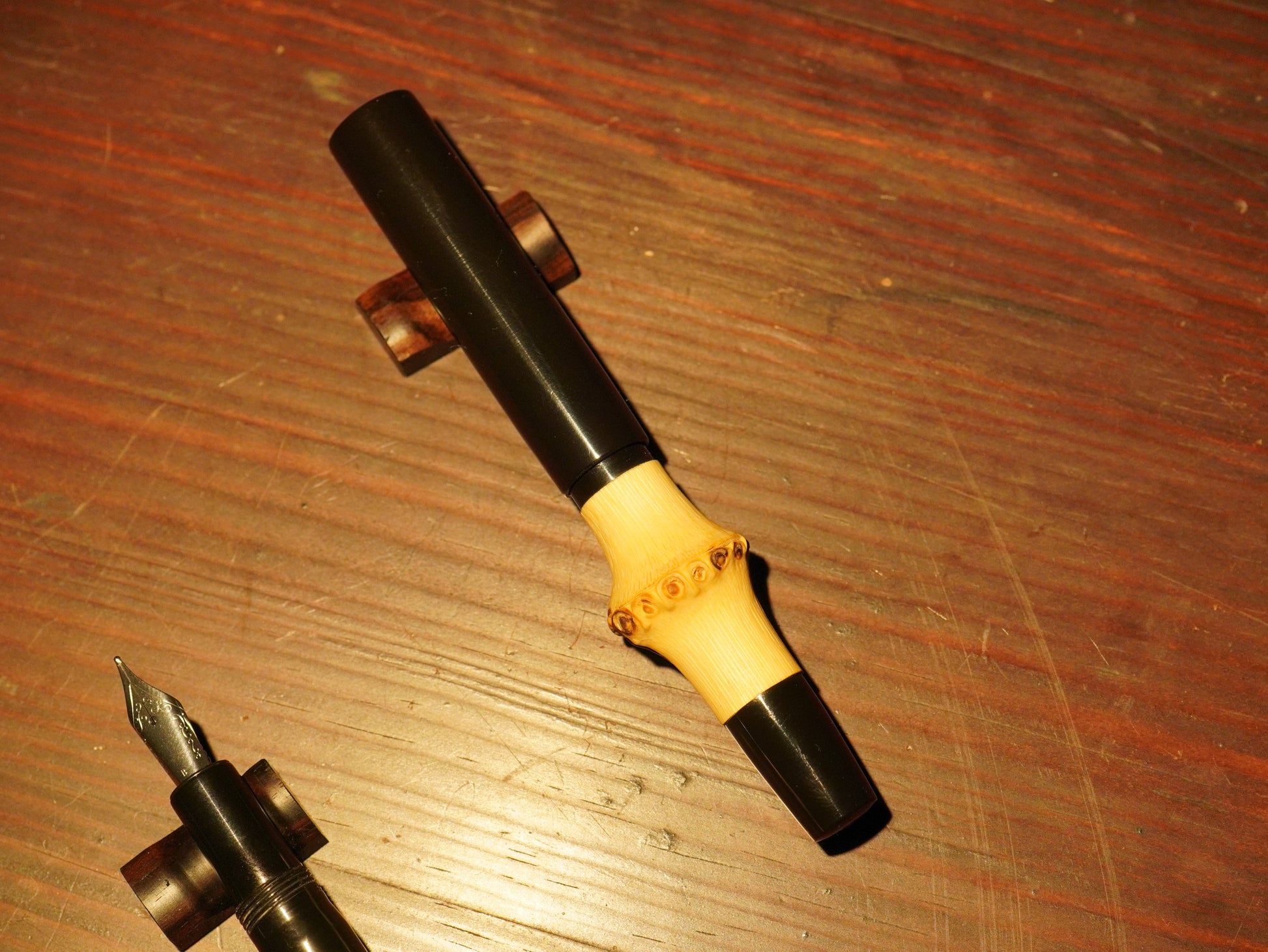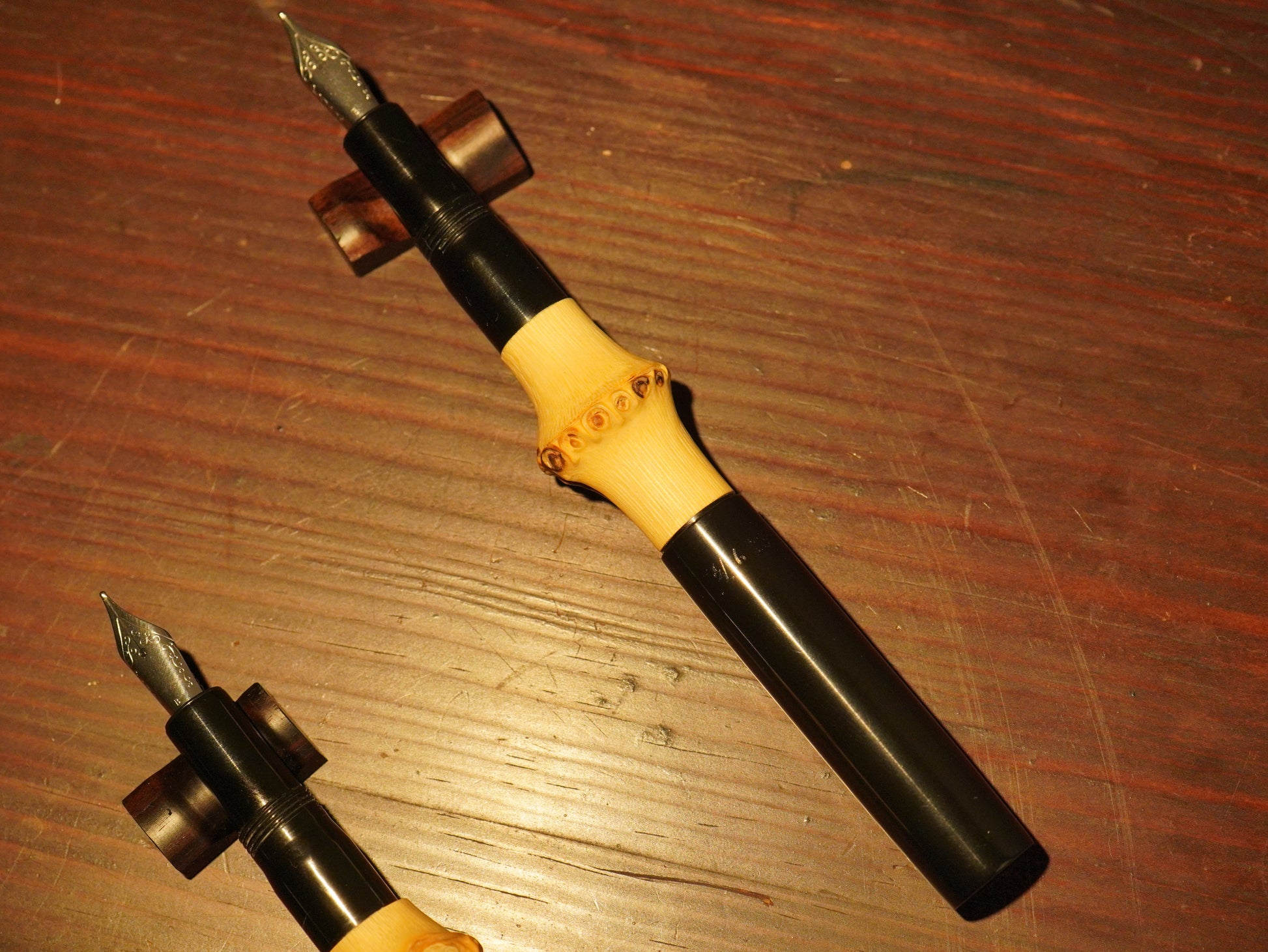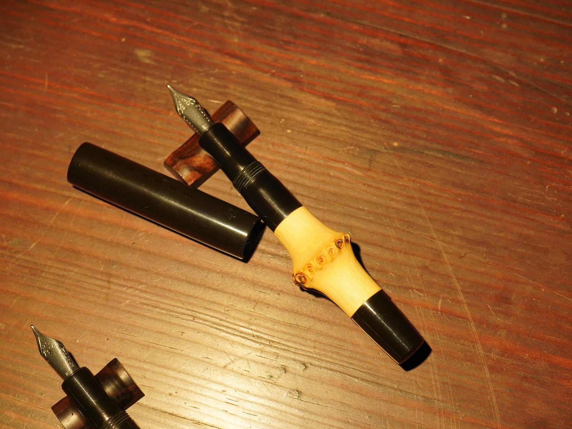 ブラックの部分はエボナイトを使用しております。エボナイトは1839年にグットイヤーが発明した半天然樹脂で、黒檀(エボニー)に似た外観からエボナイトと名付けられました。プラスチックではなく、天然ゴムの「硬質ゴム」に分類されます。エボナイトの優しい手触りは、人肌で冷たすぎず指に馴染む感触で、温かみのある触感が感じられます。変色対策として、カーボンを混入していただいています。