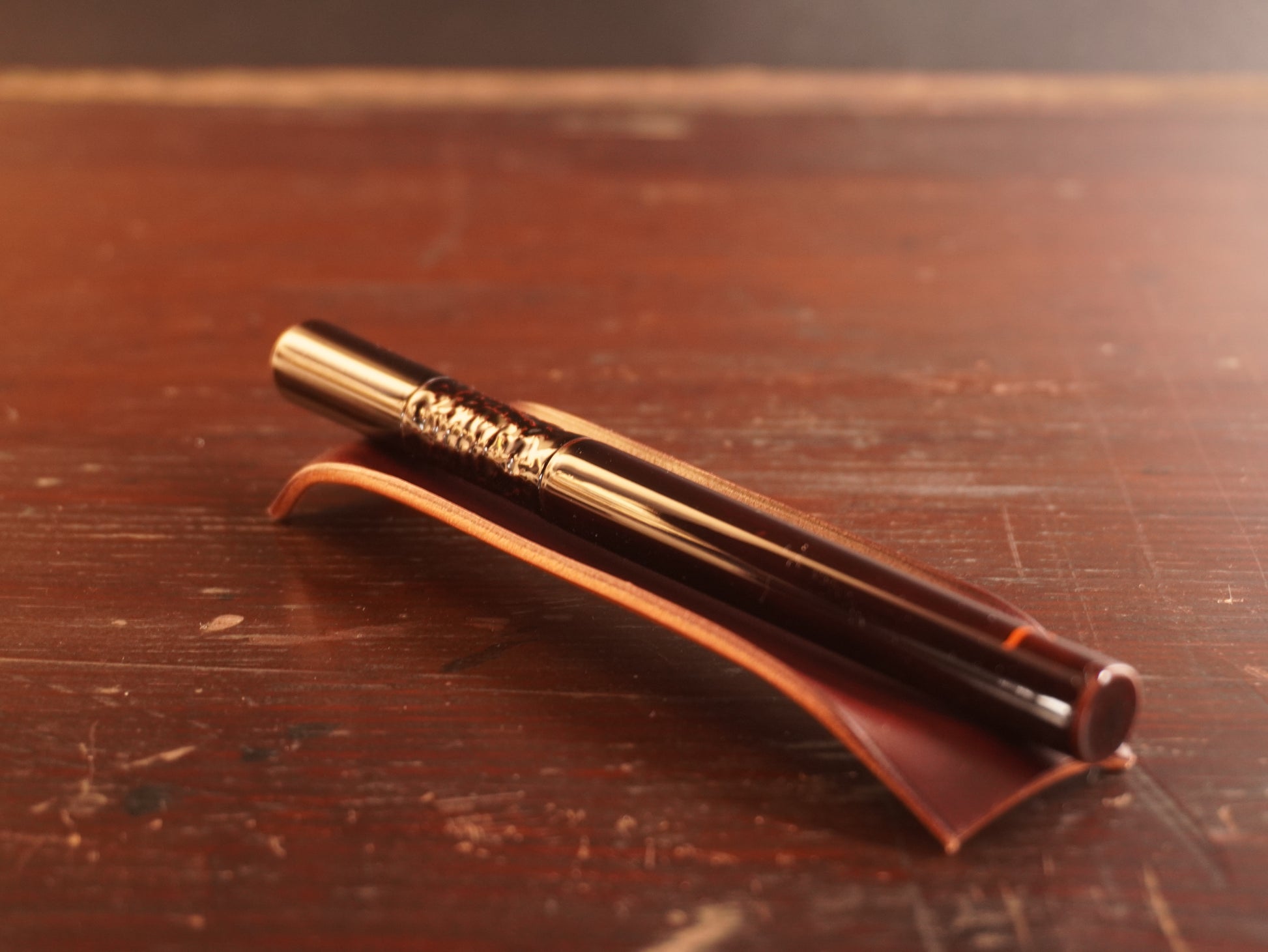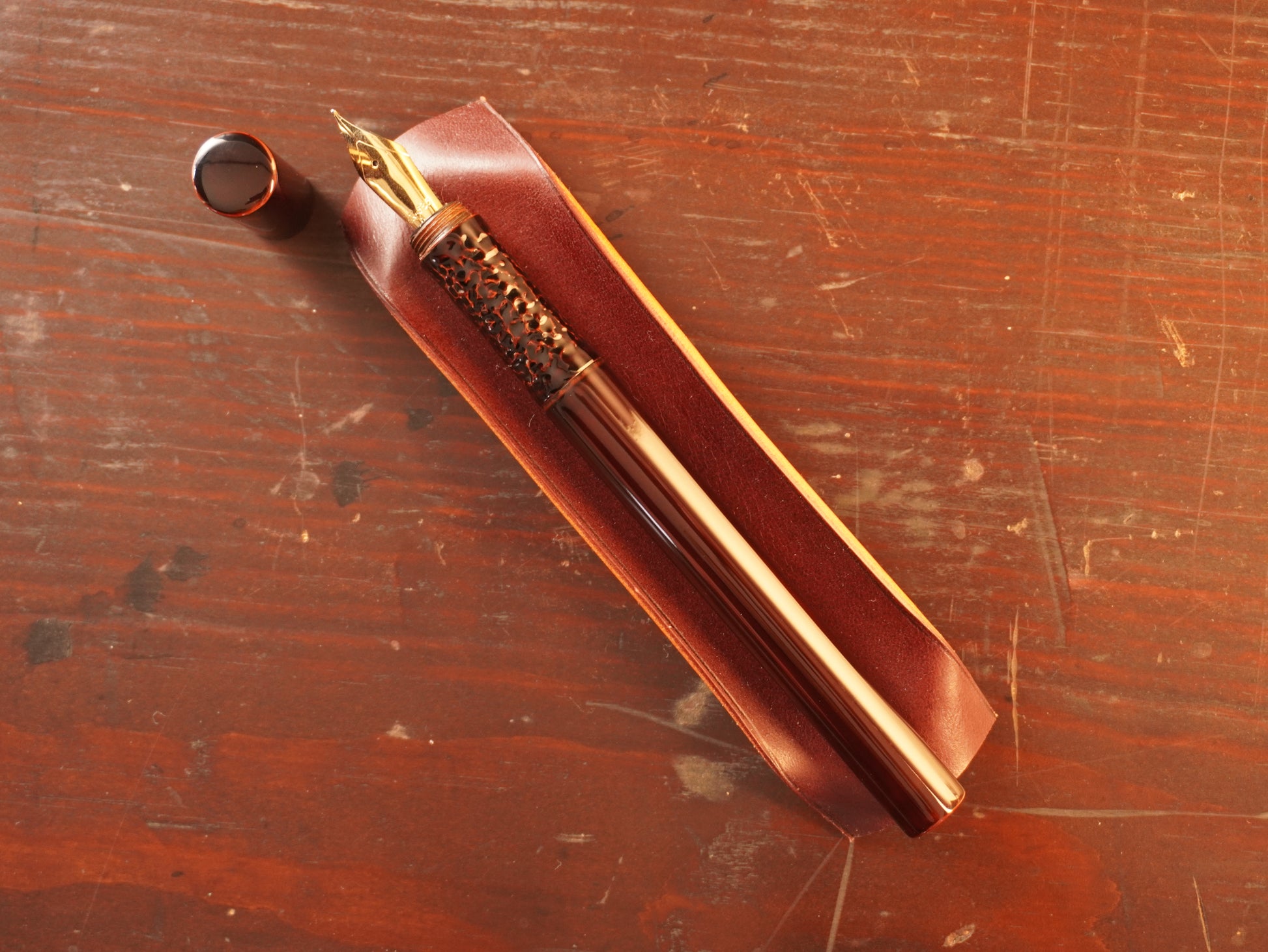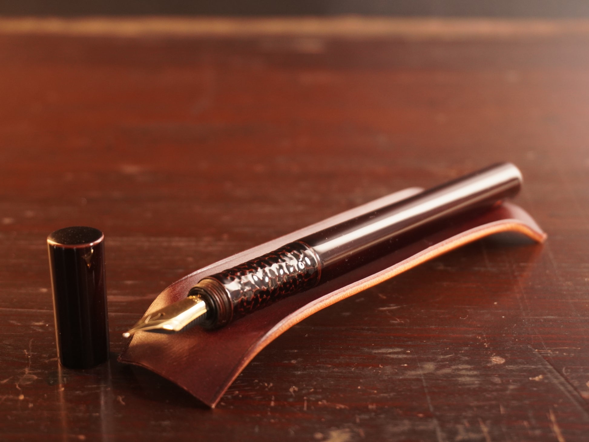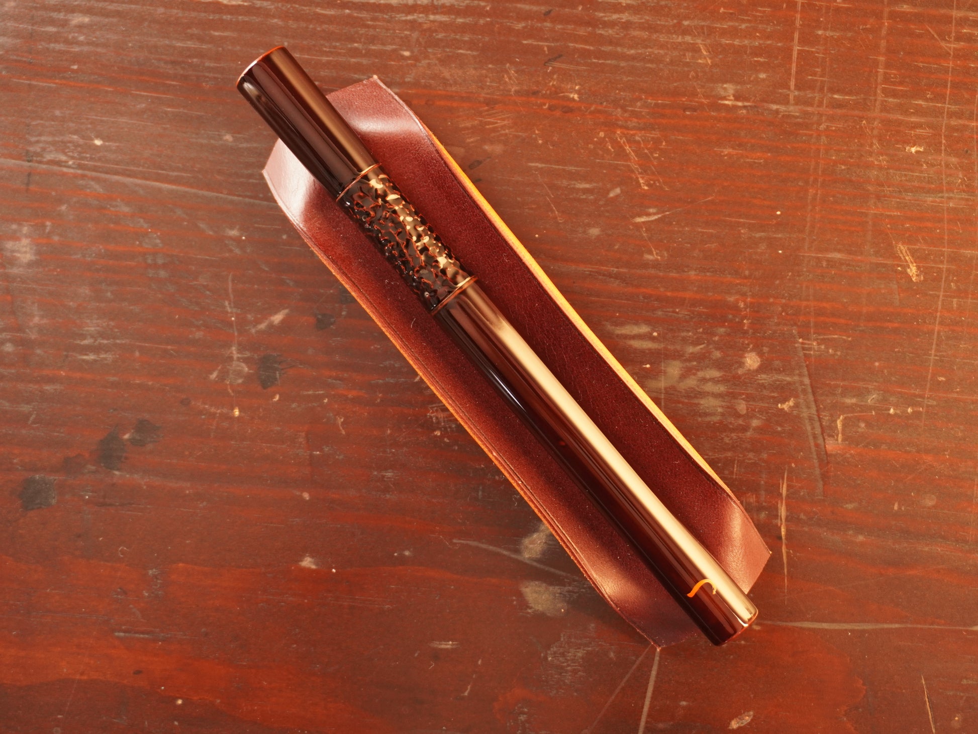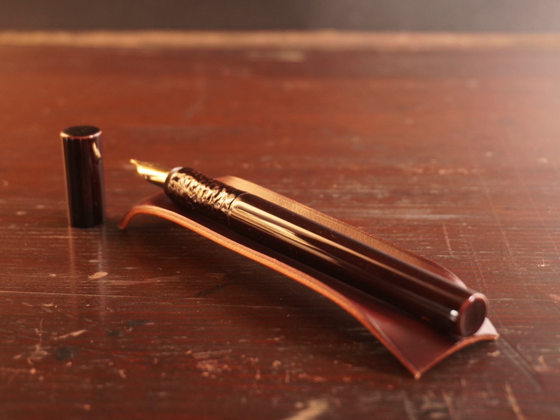 漆の控えめな美しさとテクスチャーの凹凸から、かすかに見える淡口の柿色…これから手元でさらにその美しさが育ってゆきます。漆独特の手にぴったりとくる密着性は人肌に触れている癖のようなものもになり、やはりしっかりと長い時間の書き込みでも疲れを感じさせません。