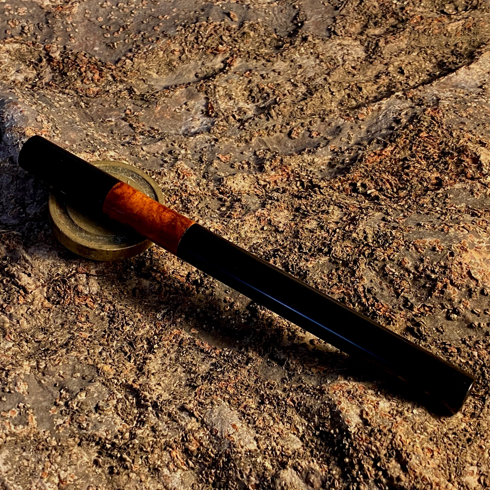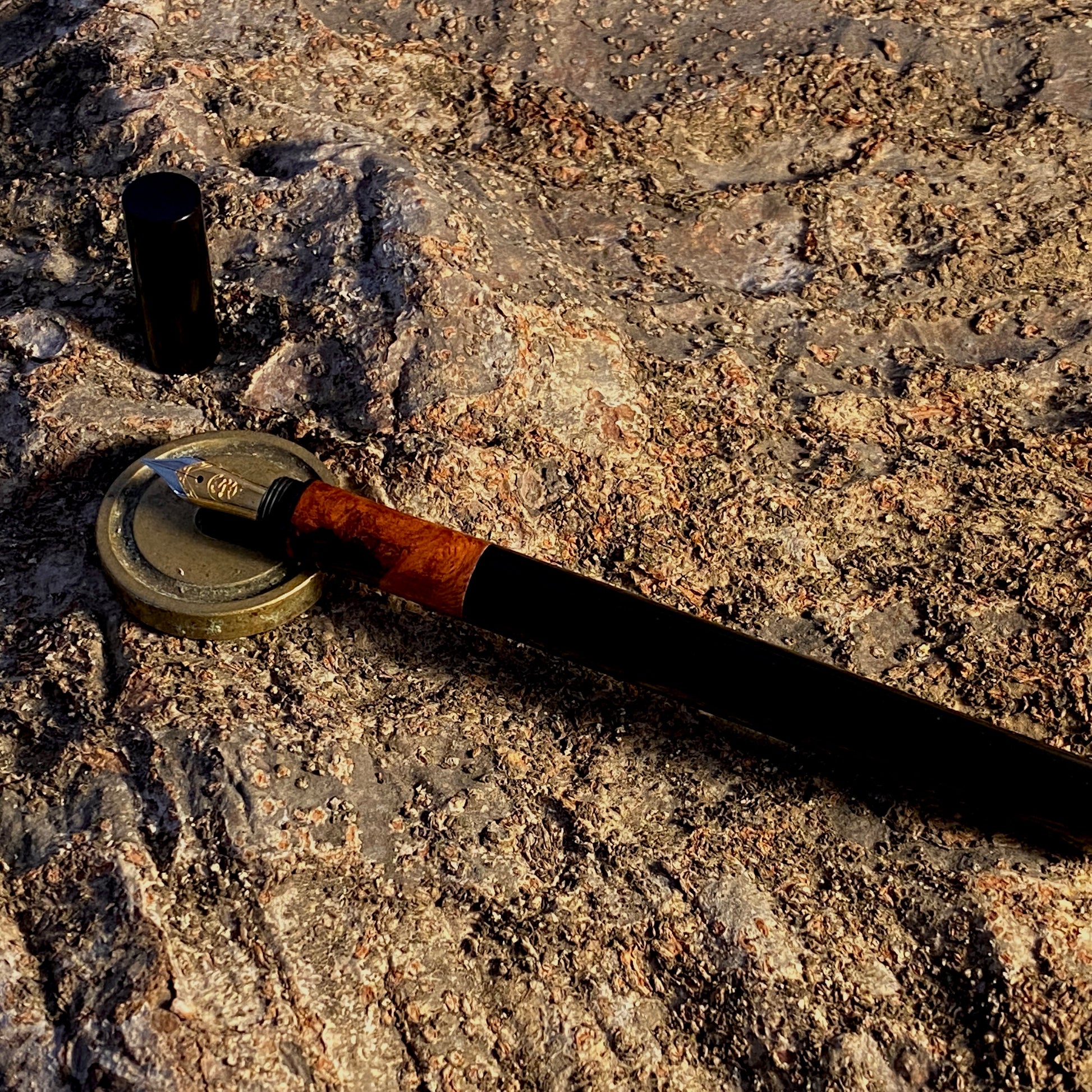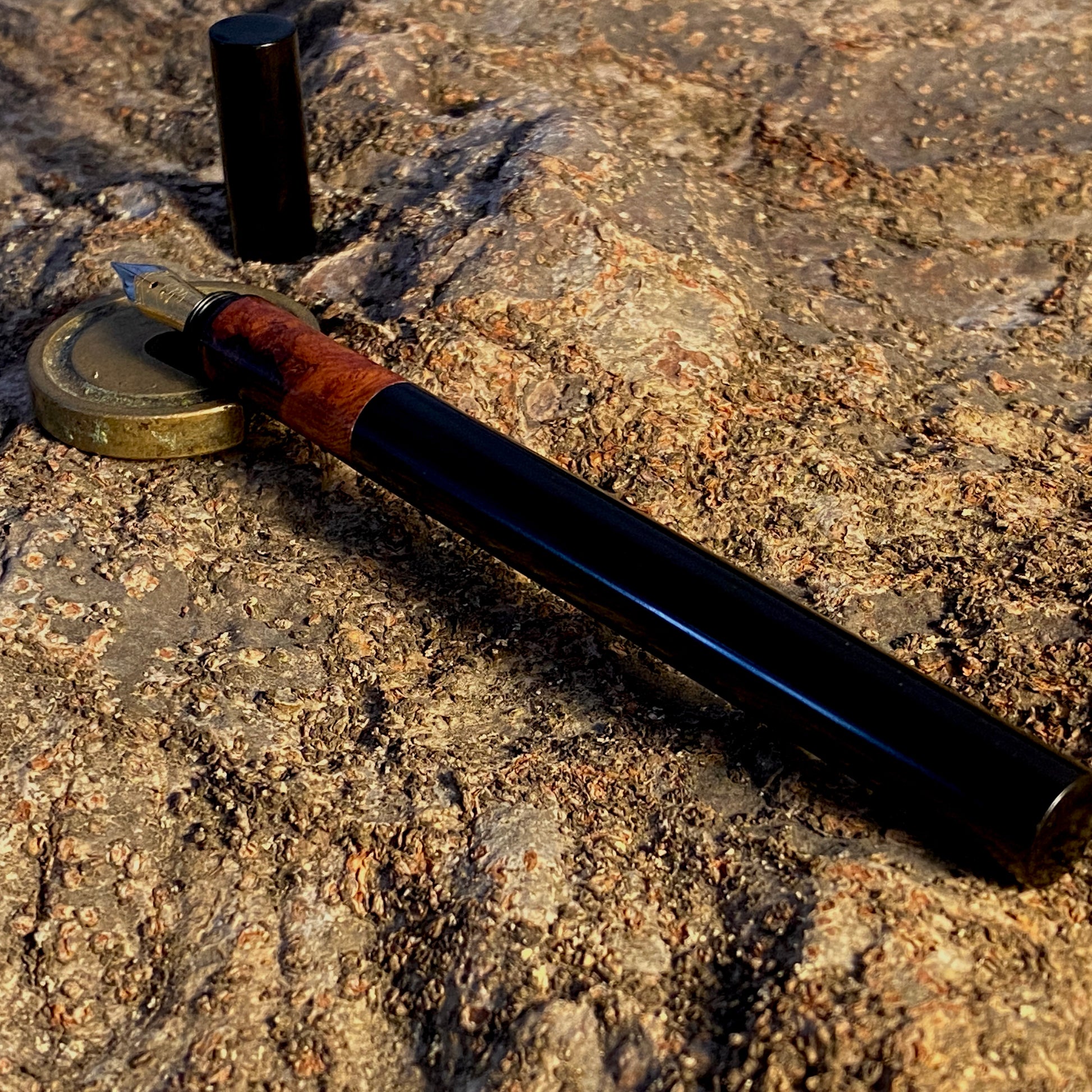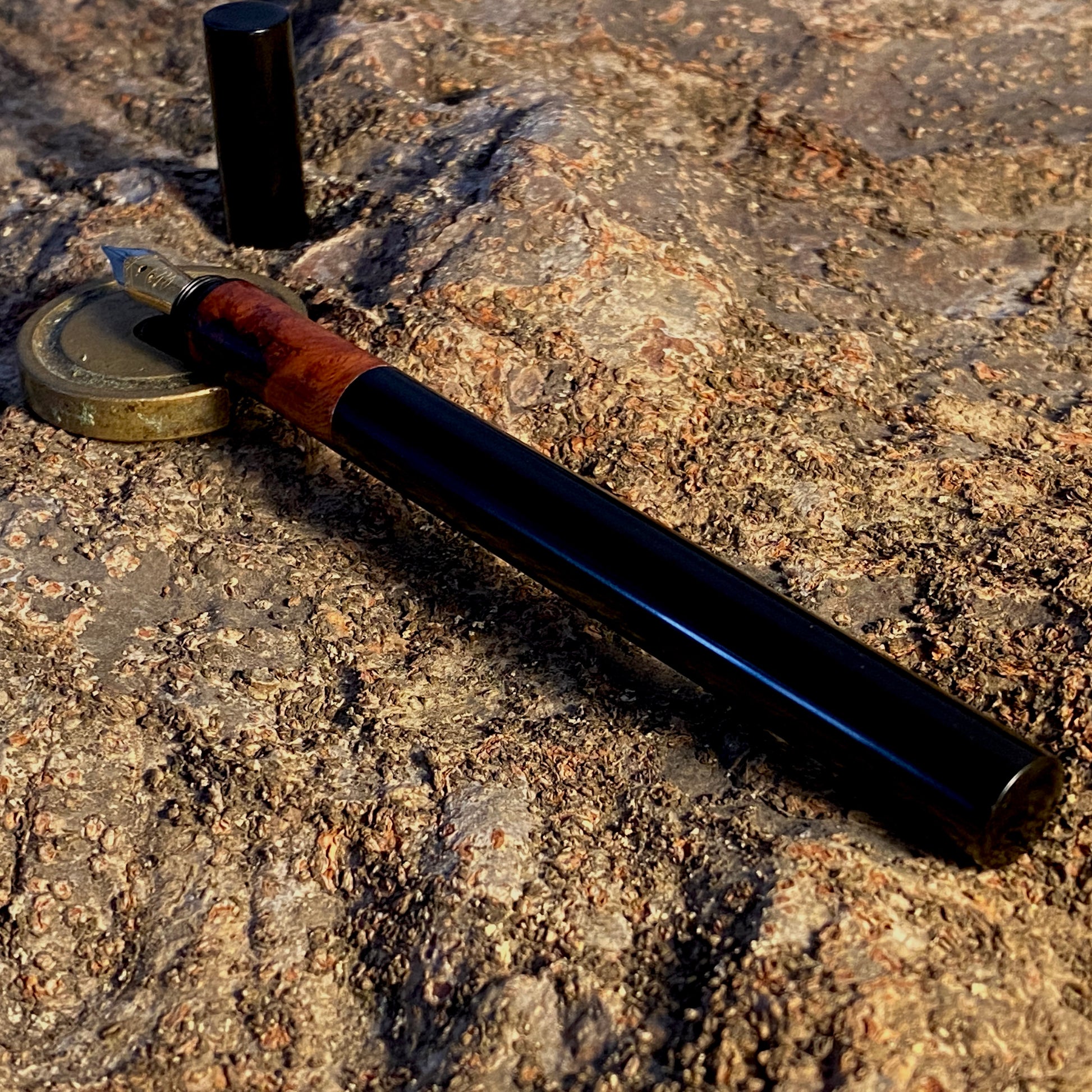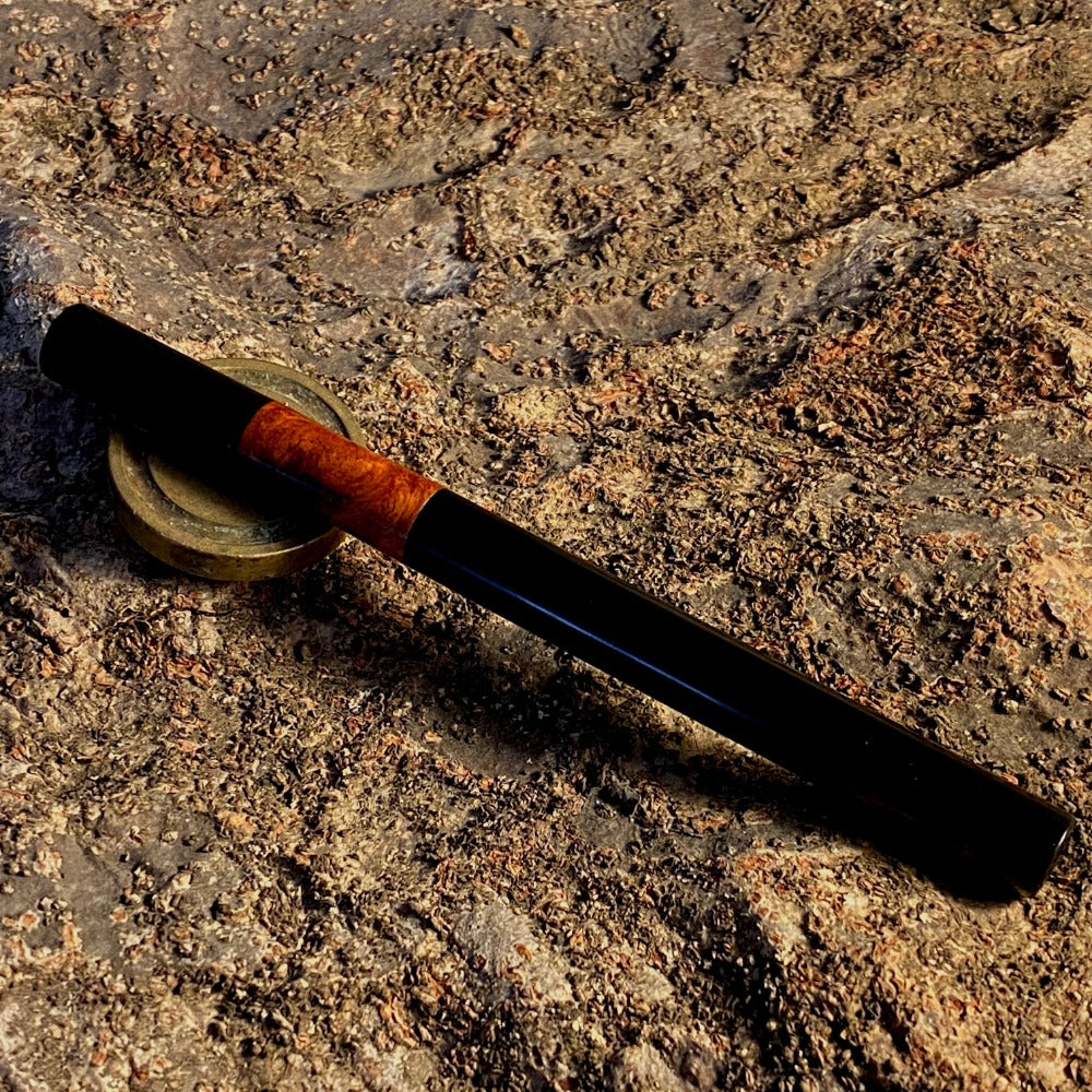 漆黒のエボナイトなかに、複雑で美しい花梨瘤を合わせました。このエキゾチックな杢目を首軸として用いたクラシックで新しいタイプの万年筆です。月夜と比べて、細くエレガントなバランスになっています。