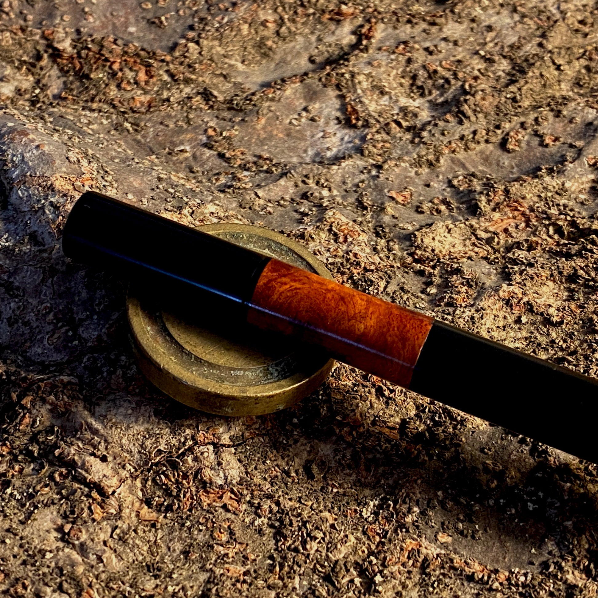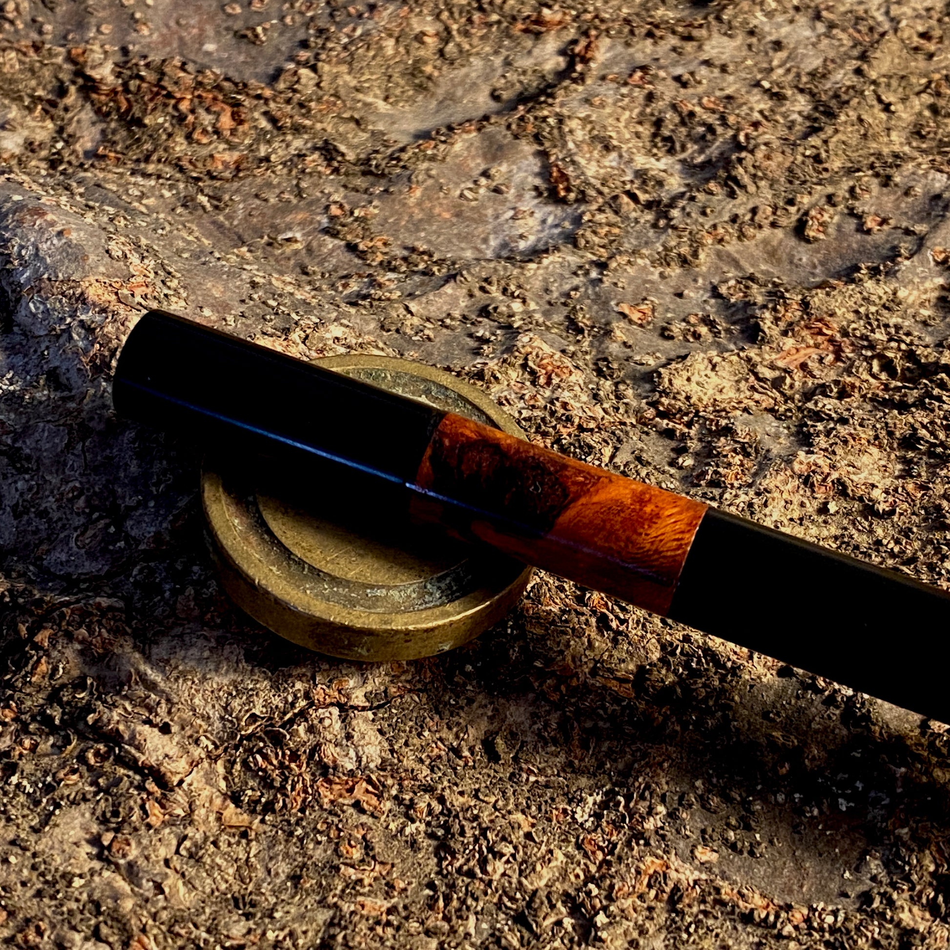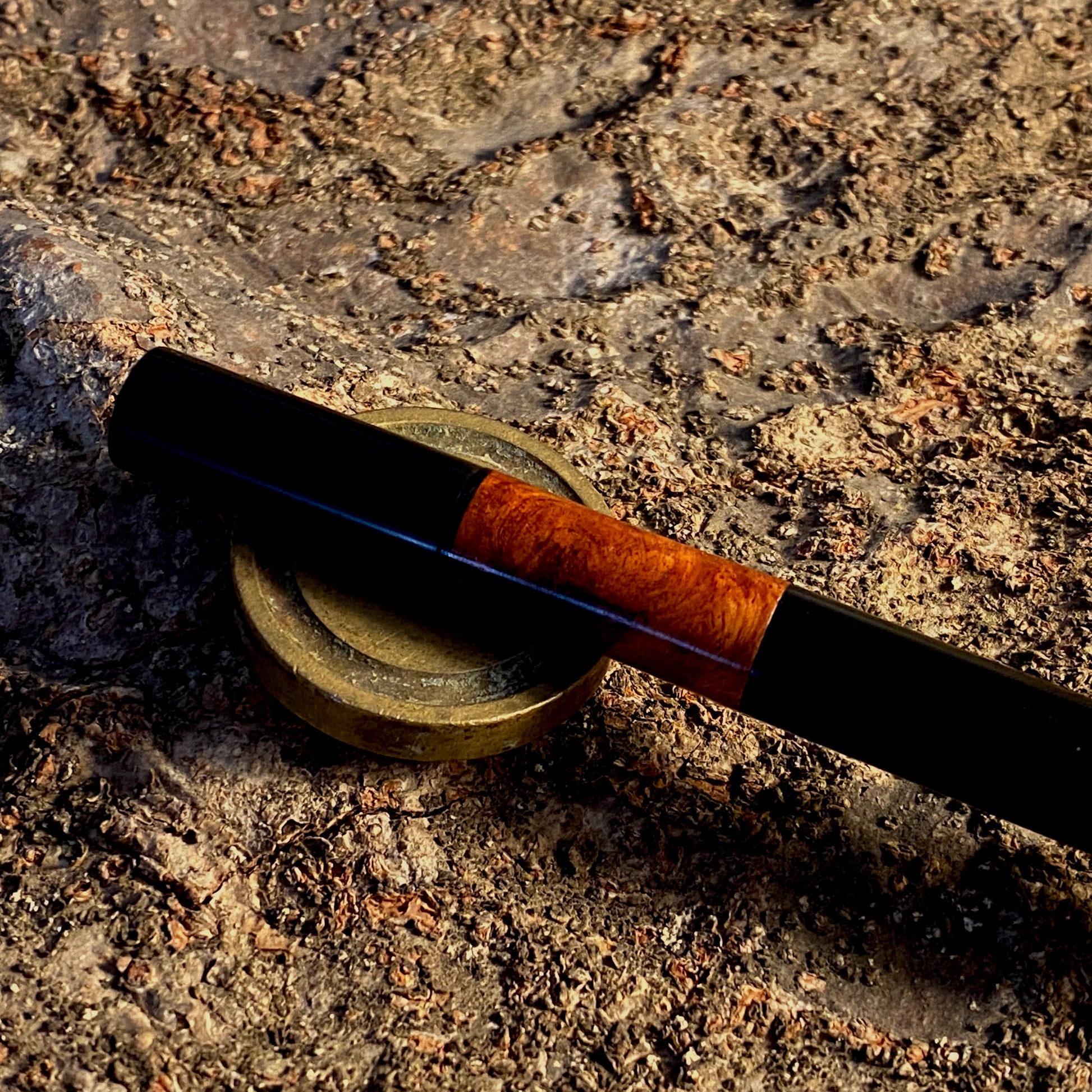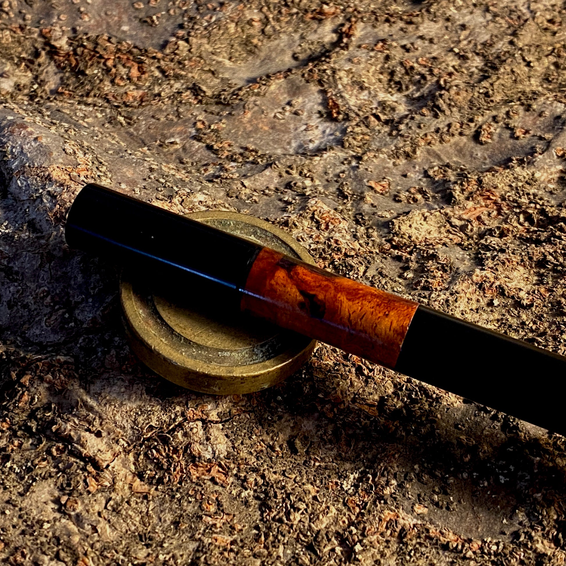 漆黒のエボナイトなかに、複雑で美しい花梨瘤を合わせました。このエキゾチックな杢目を首軸として用いたクラシックで新しいタイプの万年筆です。月夜と比べて、細くエレガントなバランスになっています。