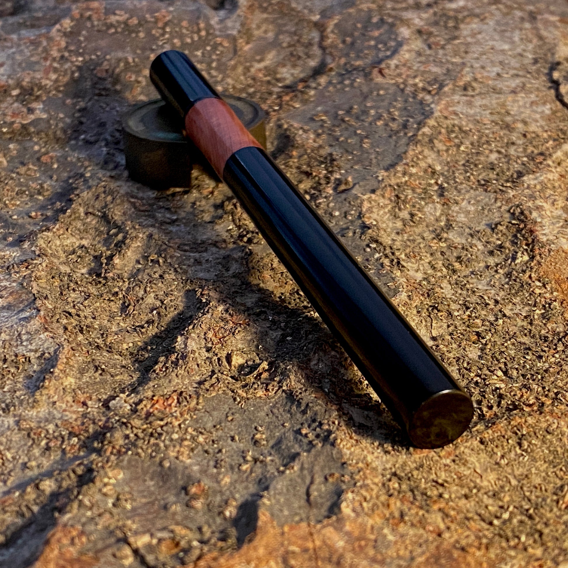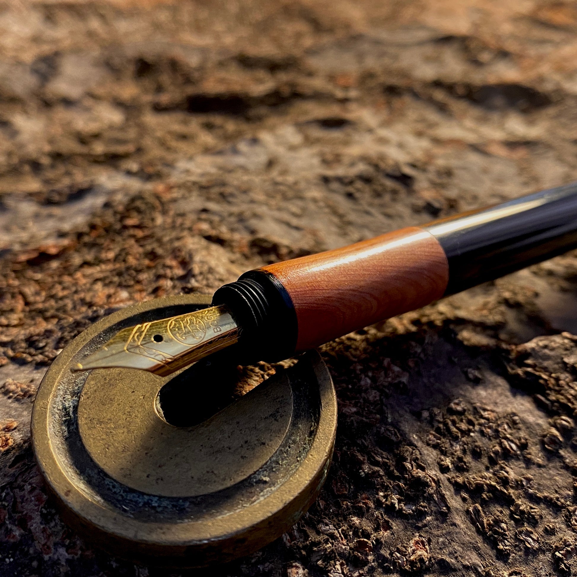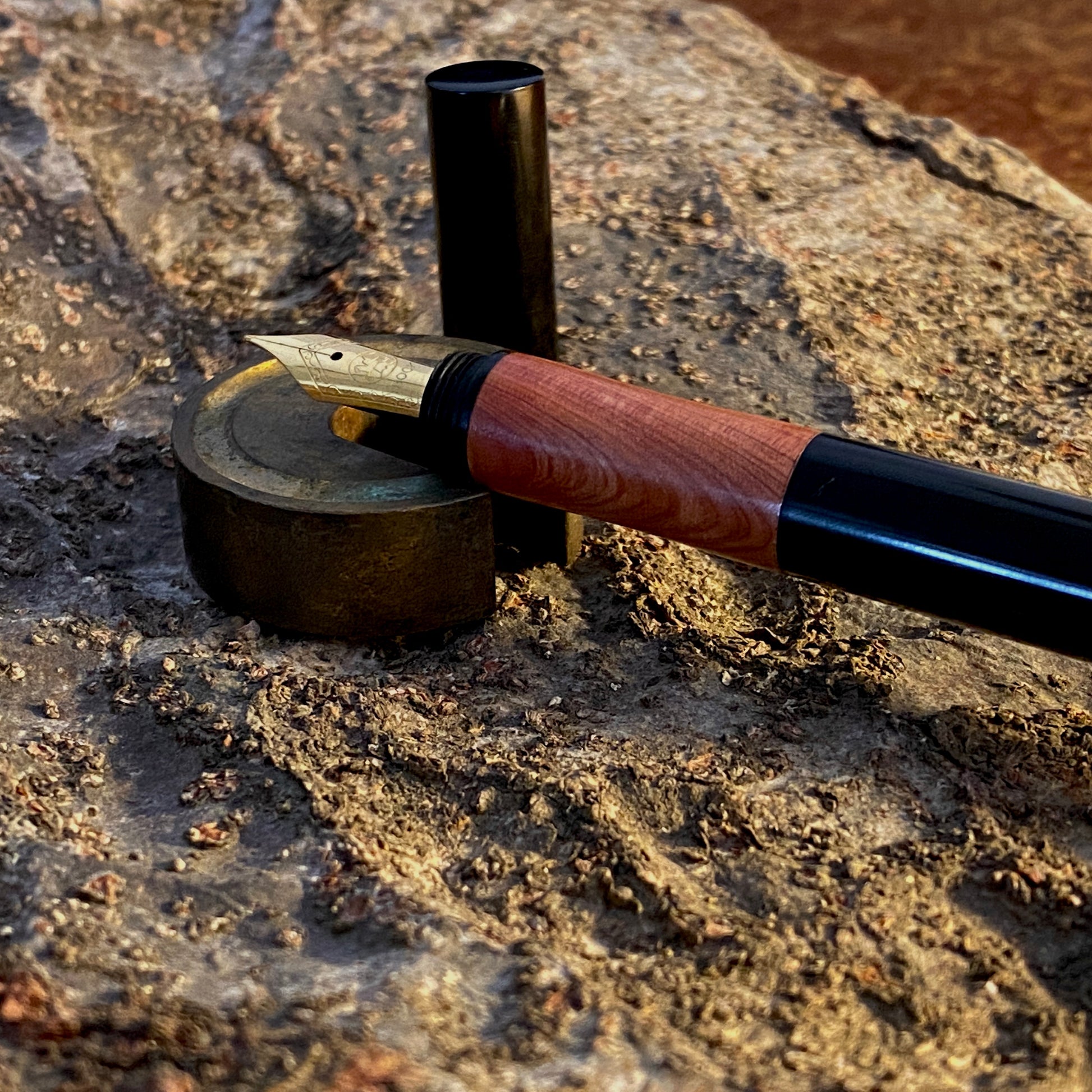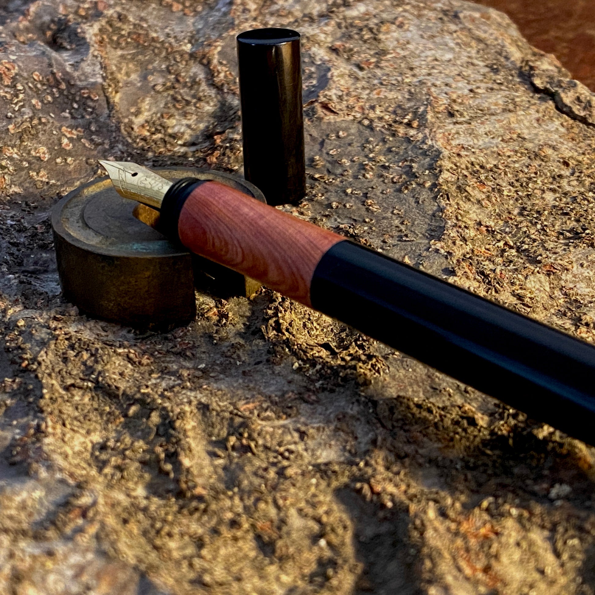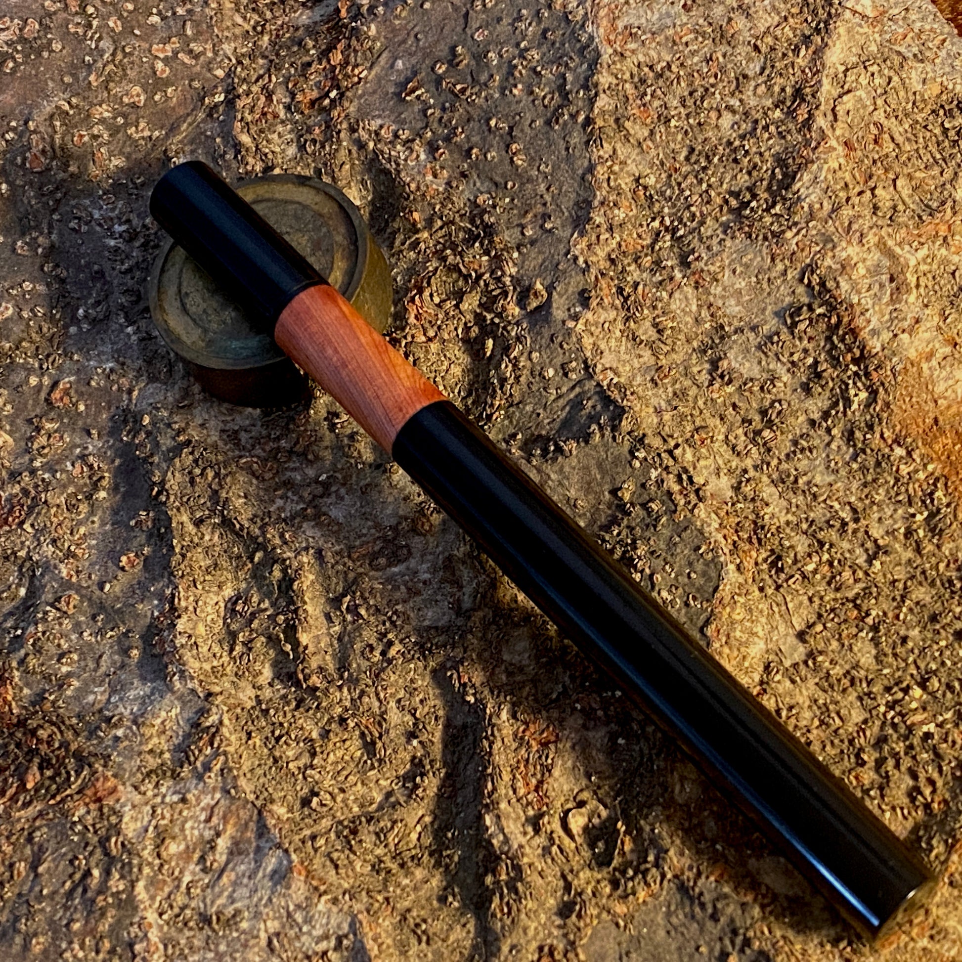 漆黒のエボナイトなかに、ヒノキ科でピンク色の天然木カイズカイブキを合わせました。この優しいピンク色の杢目を首軸として用いたクラシックで新しいタイプの万年筆です。月夜と比べて、細くエレガントなバランスになっています。