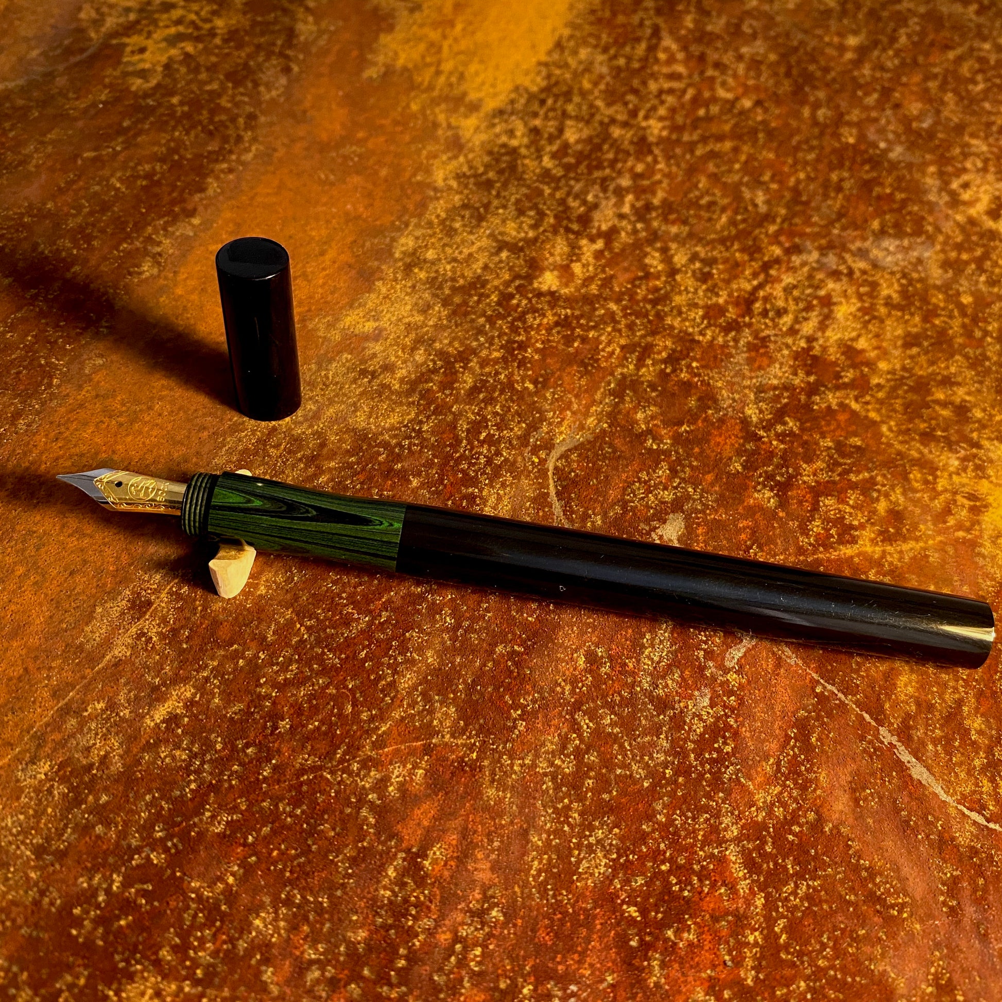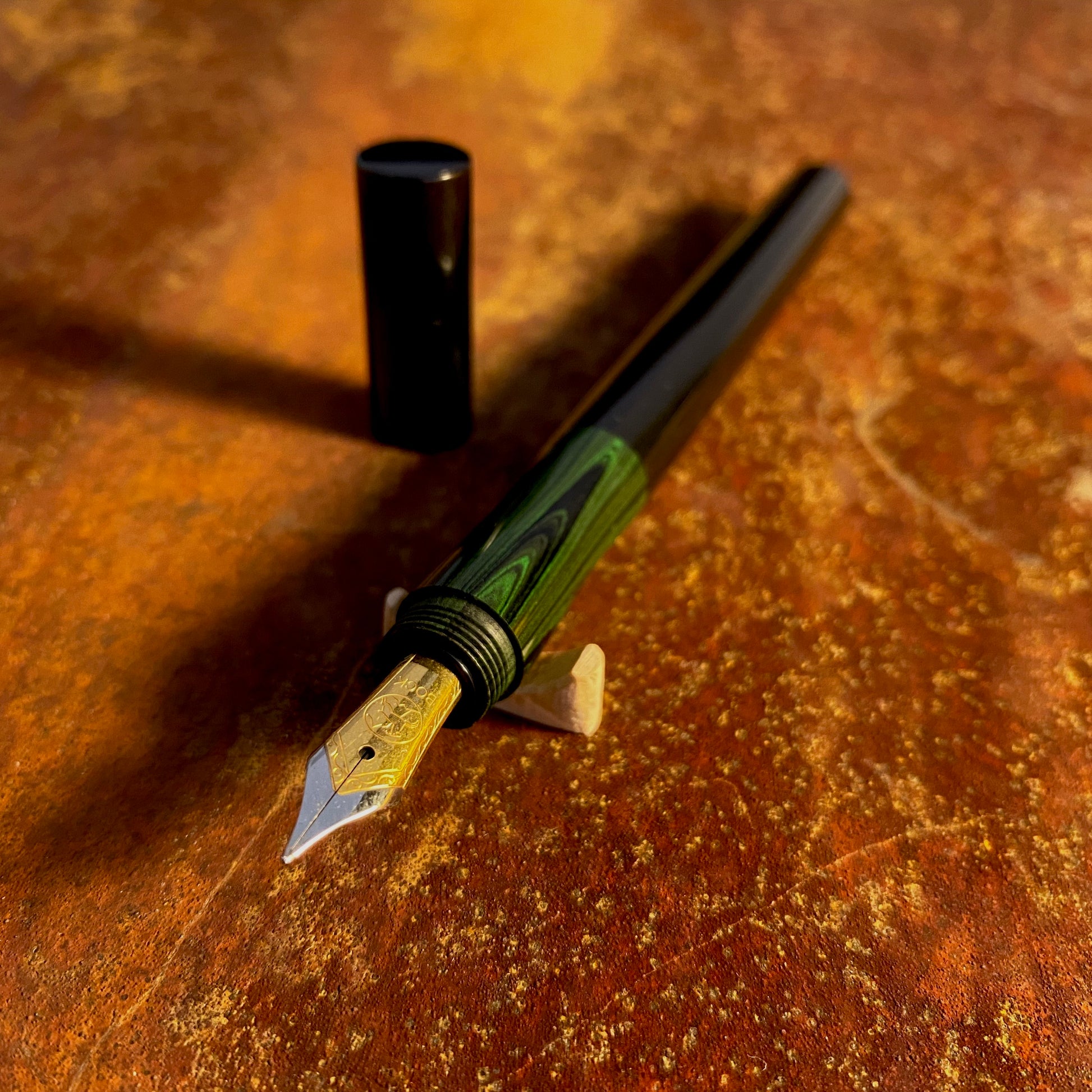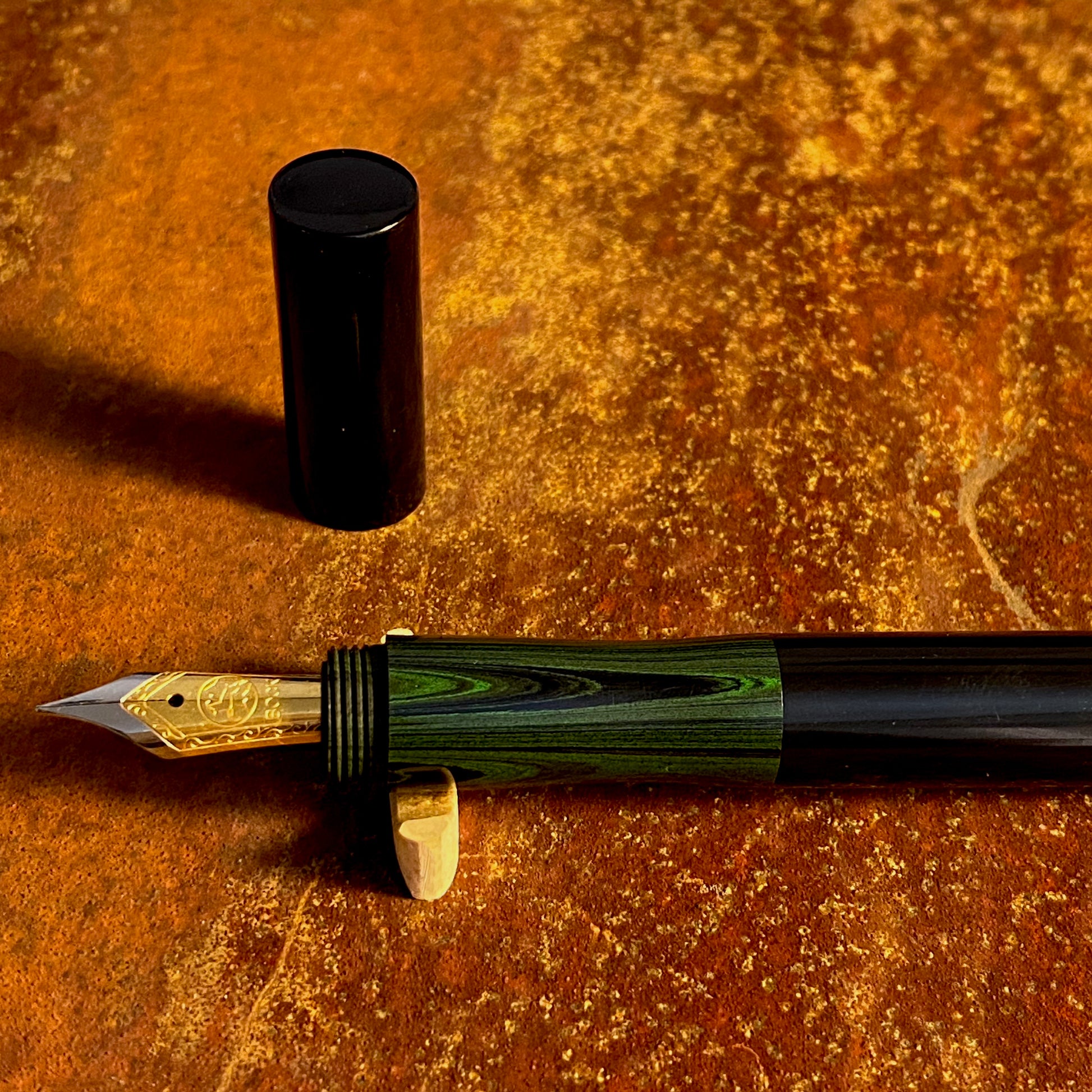 漆黒のエボナイトなかに、グリーン波模様のカラーエボナイトが引き立つ、首軸部分がむき出しになっているクラシックで新しいタイプの万年筆です。月夜と比べて、細くエレガントなバランスになっています。