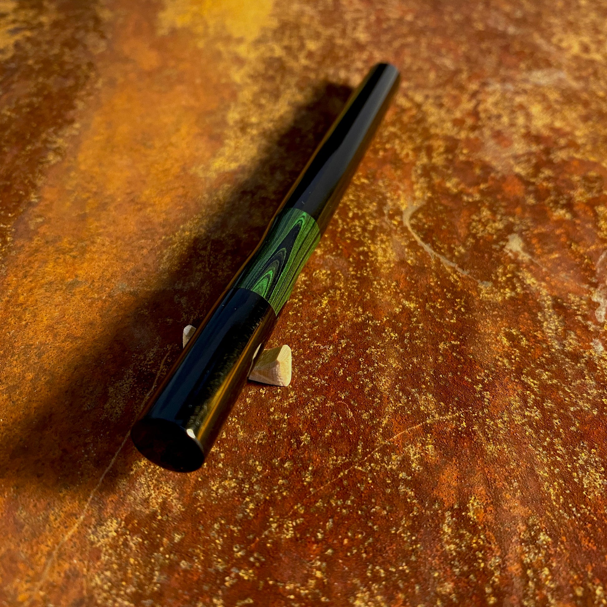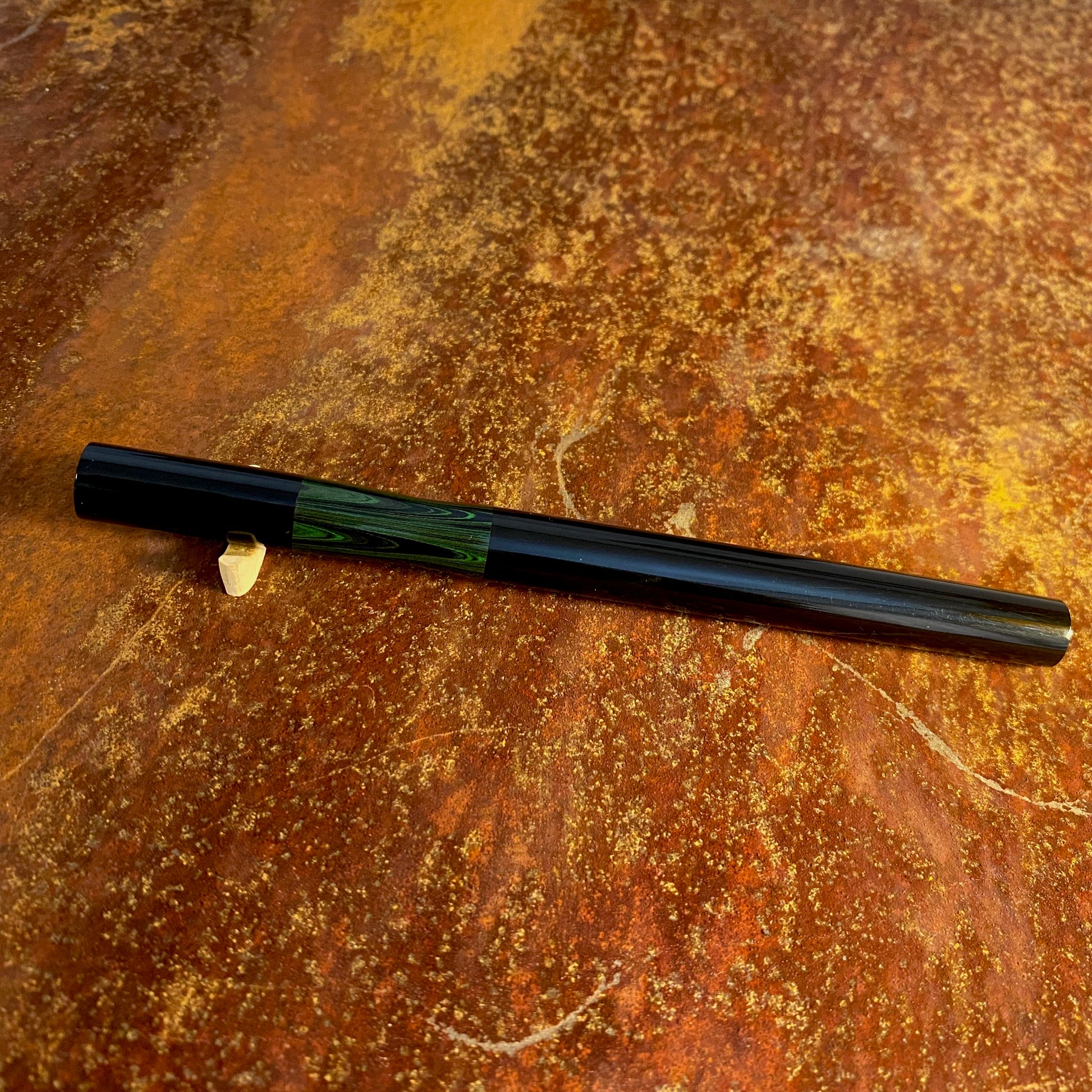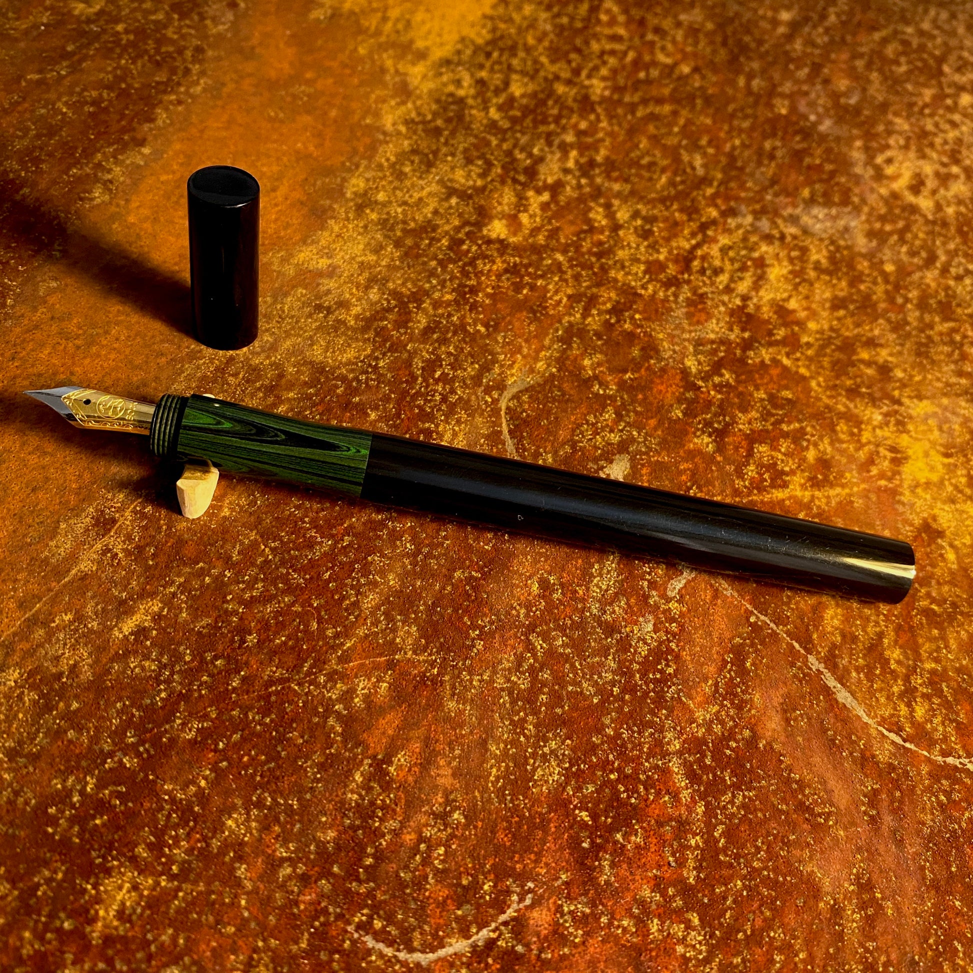漆黒のエボナイトなかに、グリーン波模様のカラーエボナイトが引き立つ、首軸部分がむき出しになっているクラシックで新しいタイプの万年筆です。月夜と比べて、細くエレガントなバランスになっています。