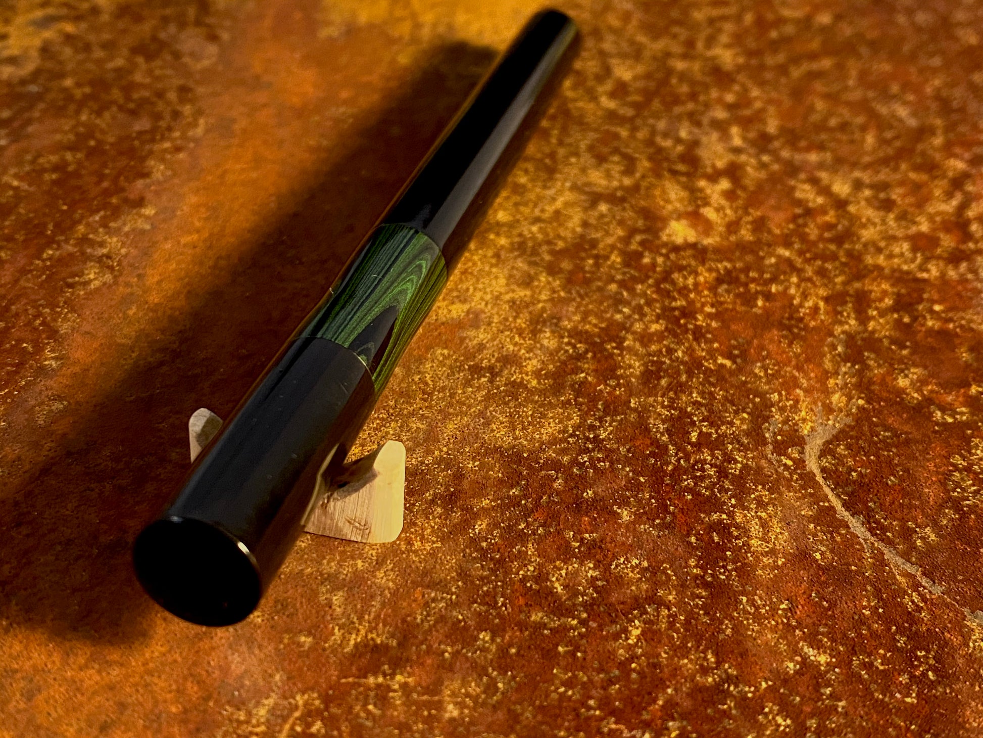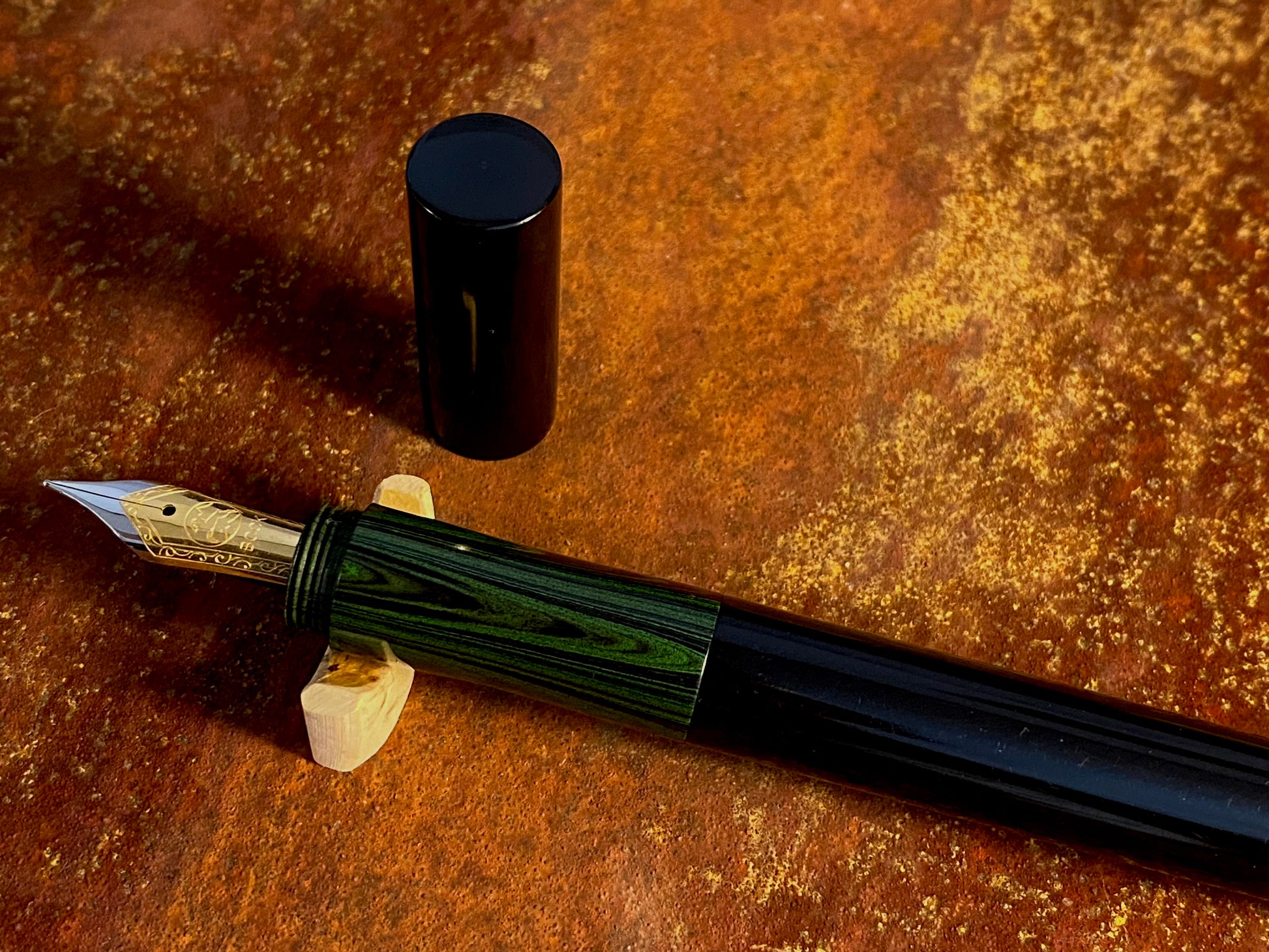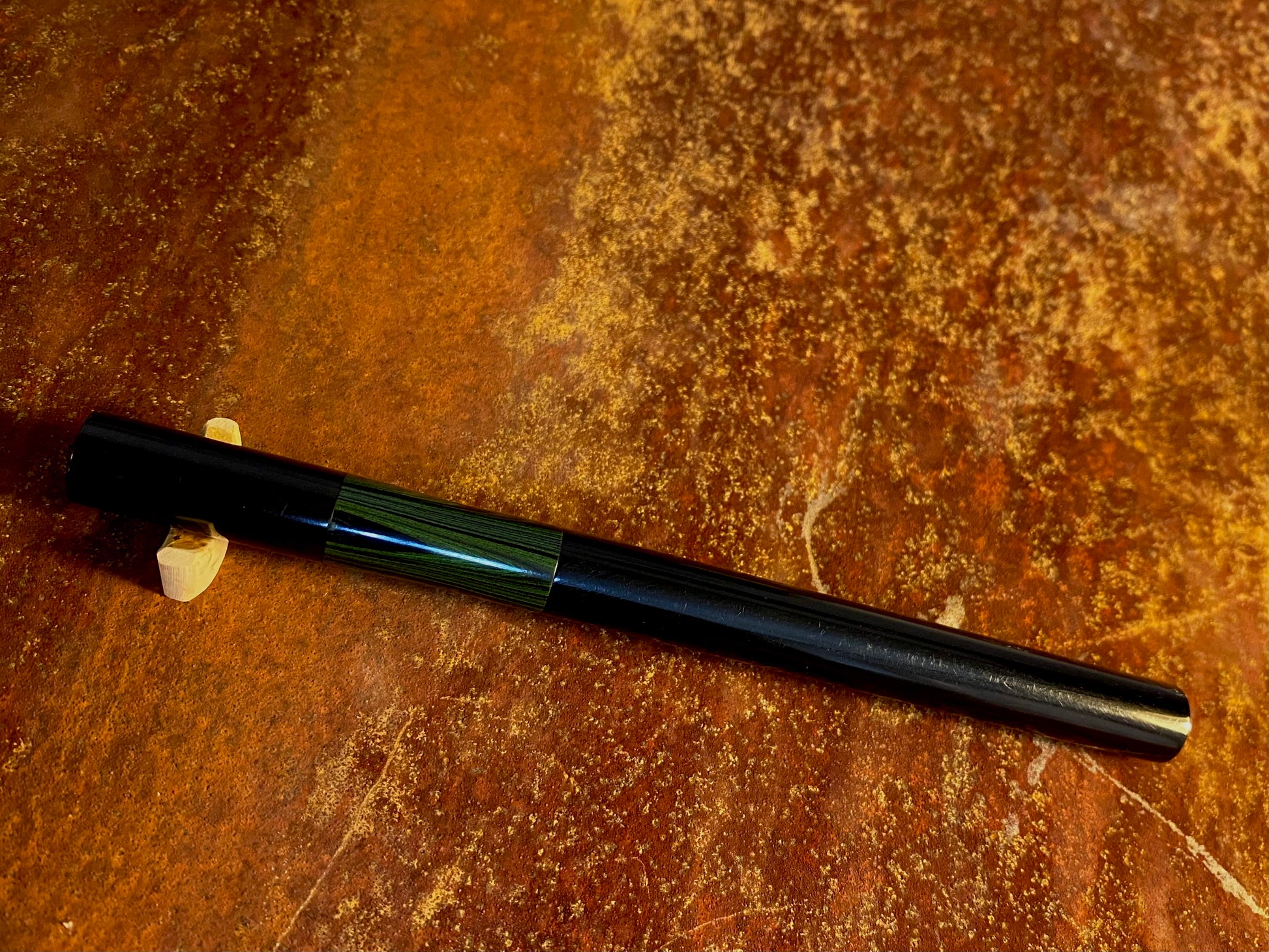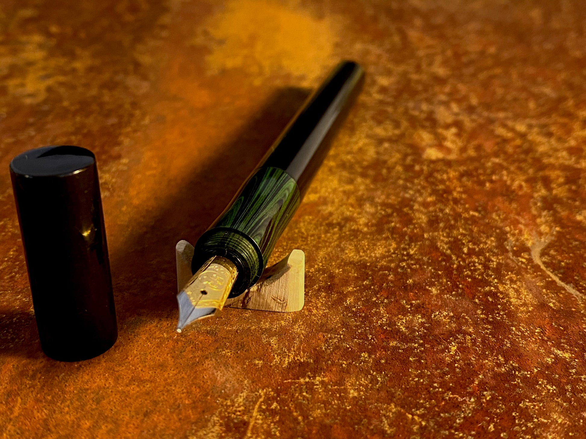 漆黒のエボナイトなかに、グリーンのカラーエボナイトが引き立つ、首軸部分がむき出しになっているクラシックで新しいタイプの万年筆です。月夜と比べて、細くエレガントなバランスになっています。