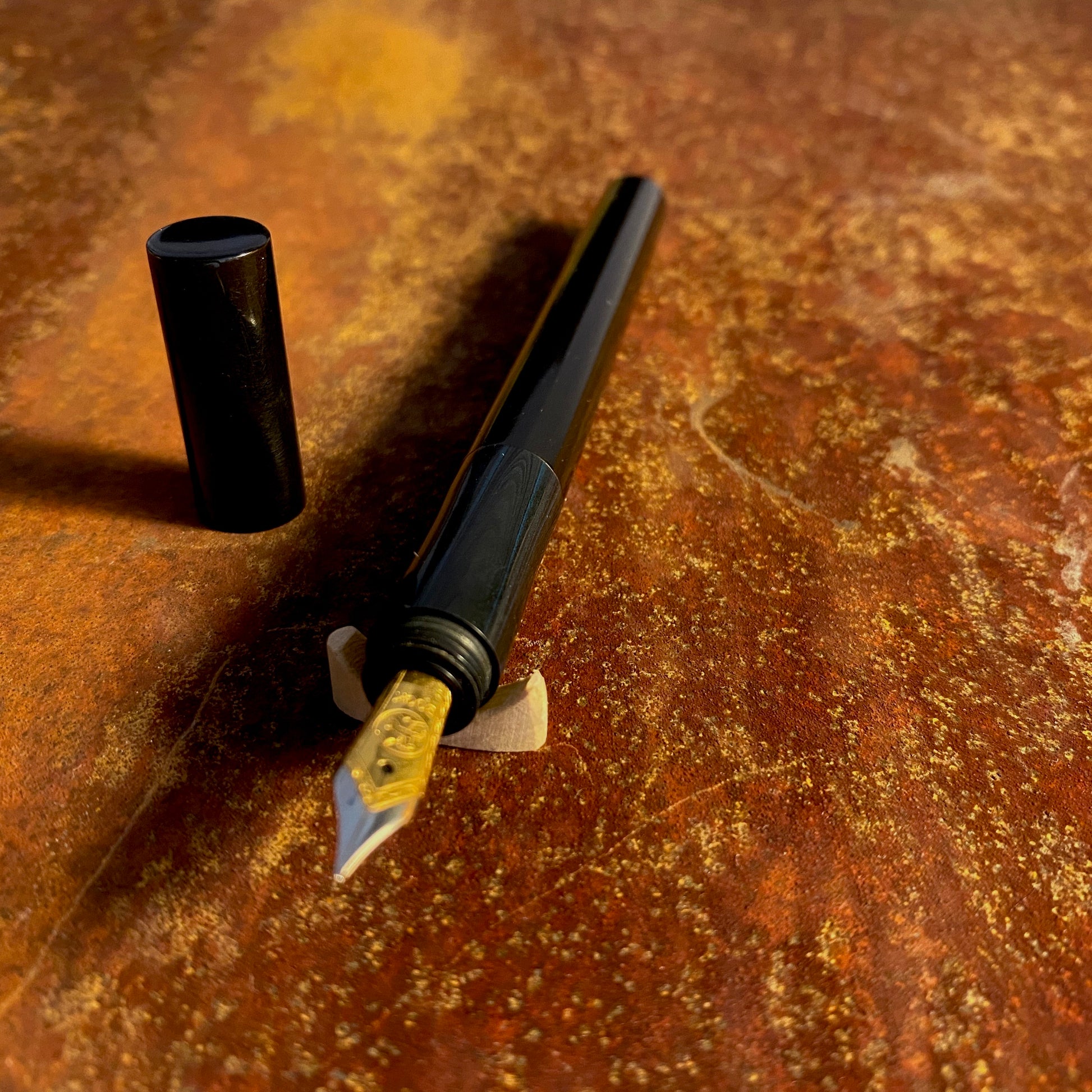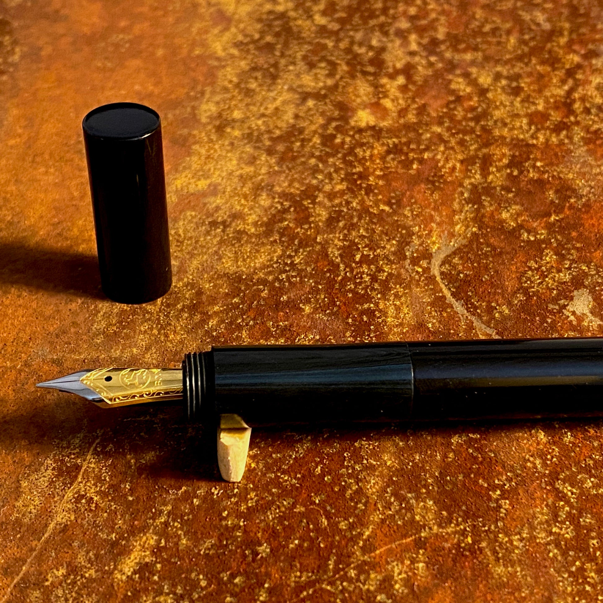 漆黒のエボナイトなかに、青の波模様のエボナイト、僅かな違いに光の加減で「おっと」と思わせる。首軸部分がむき出しになっているクラシックで新しいタイプの万年筆です。月夜と比べて、細くエレガントなバランスになっています。