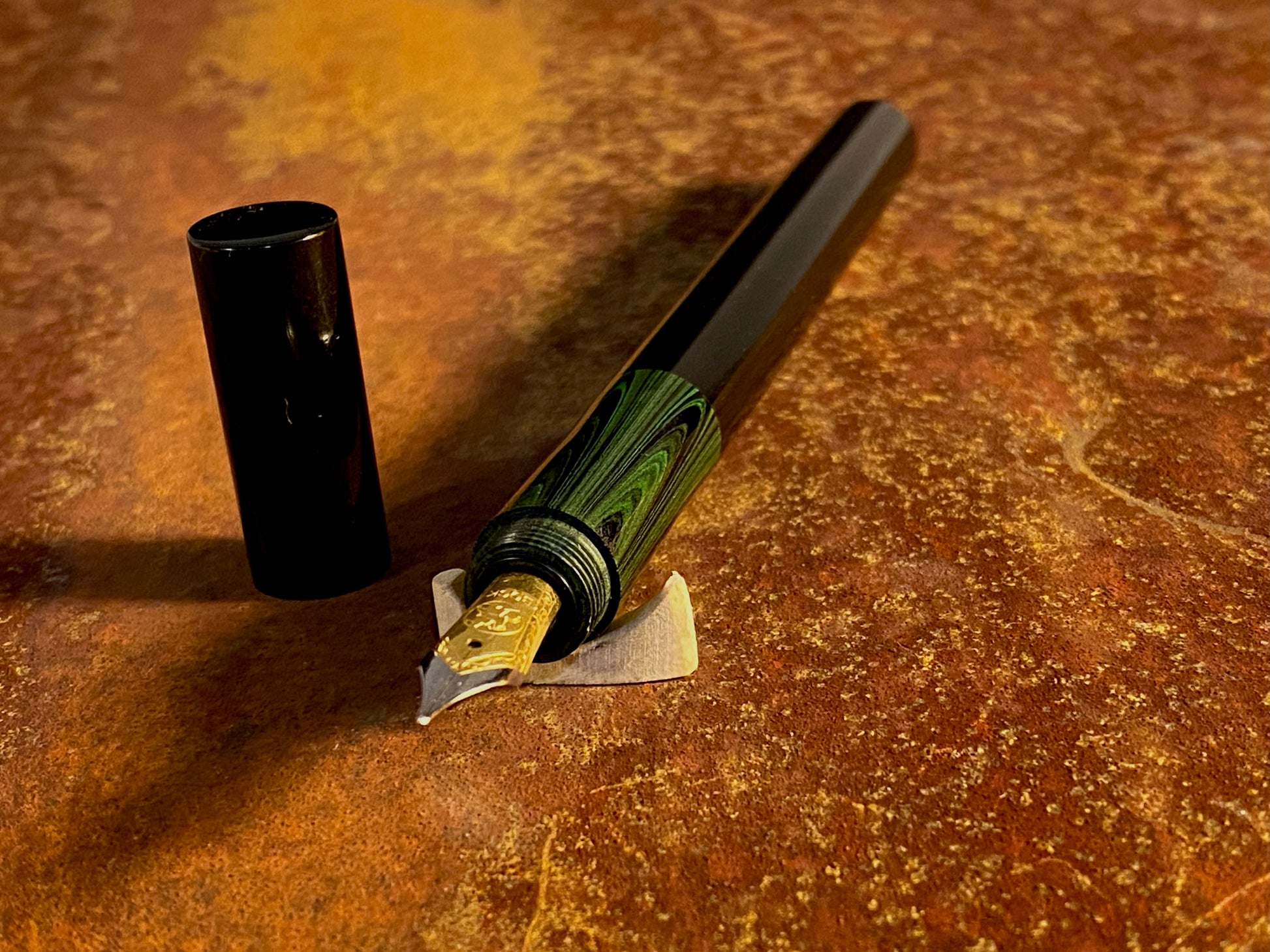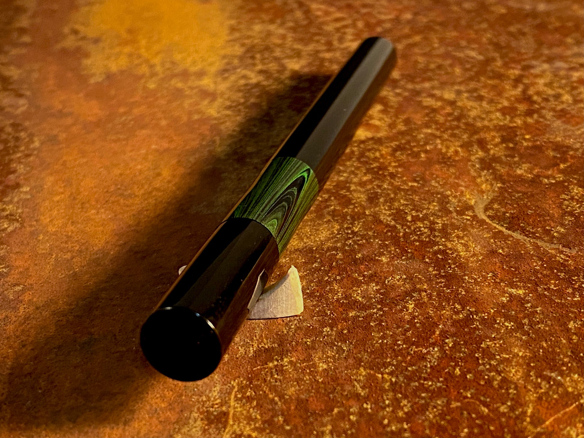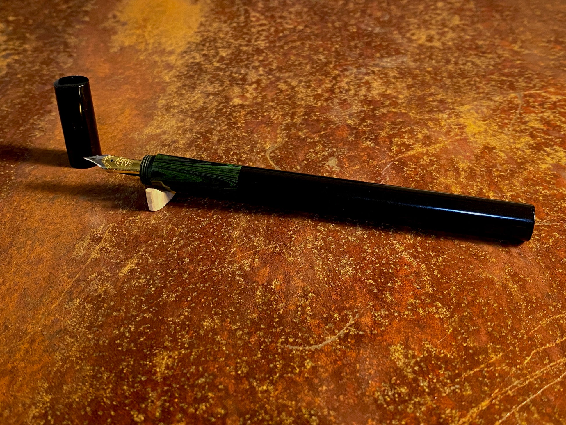 漆黒のエボナイトなかに、グリーンさざ波模様のカラーエボナイトが引き立つ、首軸部分がむき出しになっているクラシックで新しいタイプの万年筆です。月夜と比べて、細くエレガントなバランスになっています。