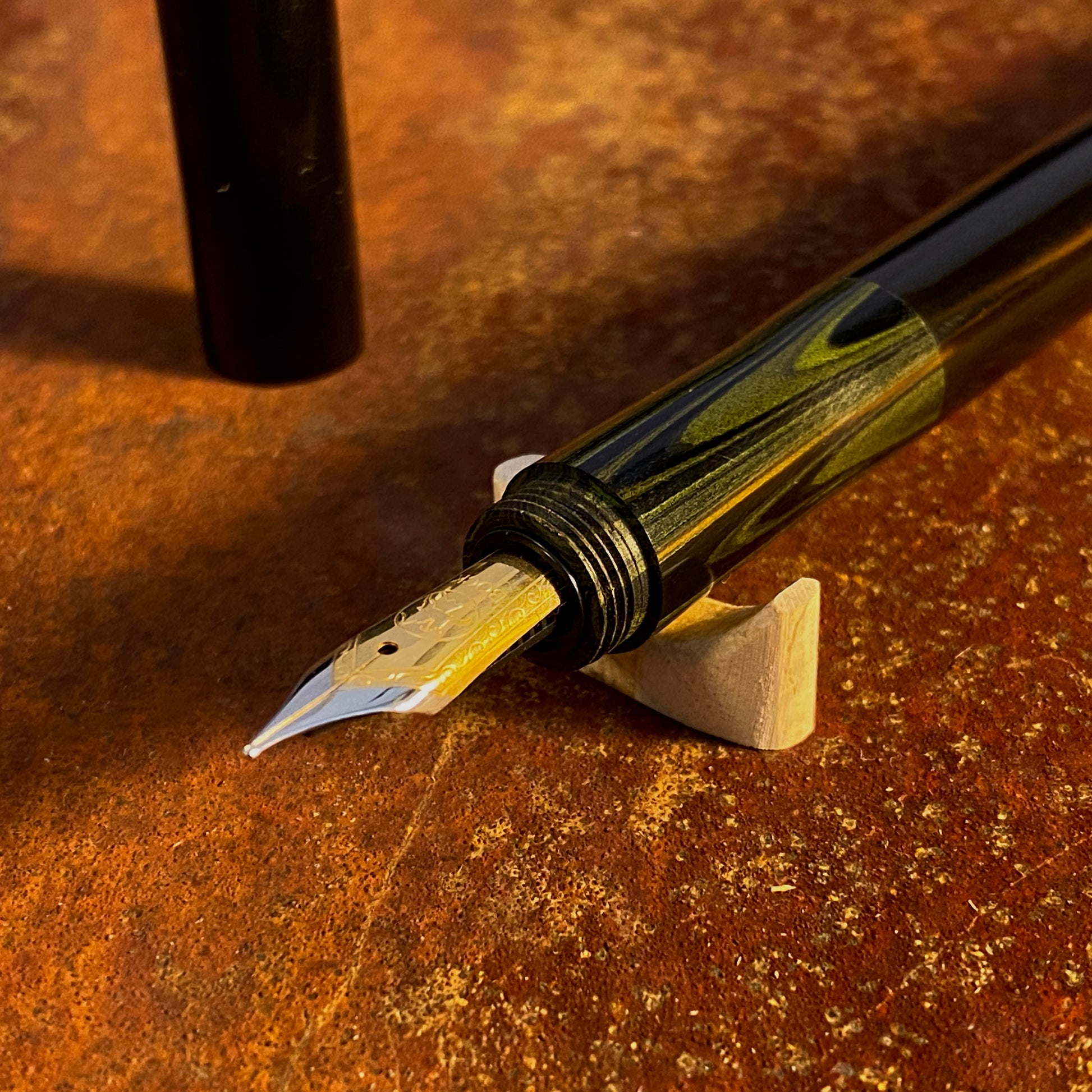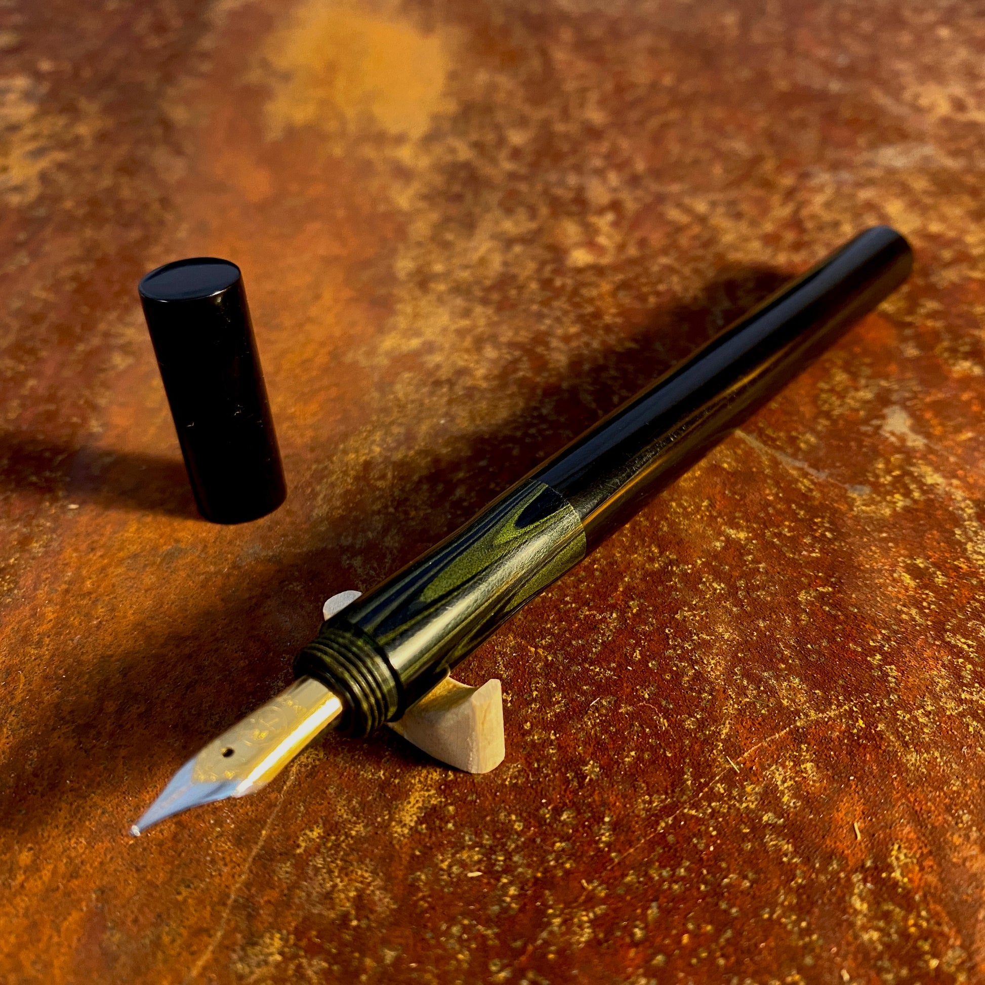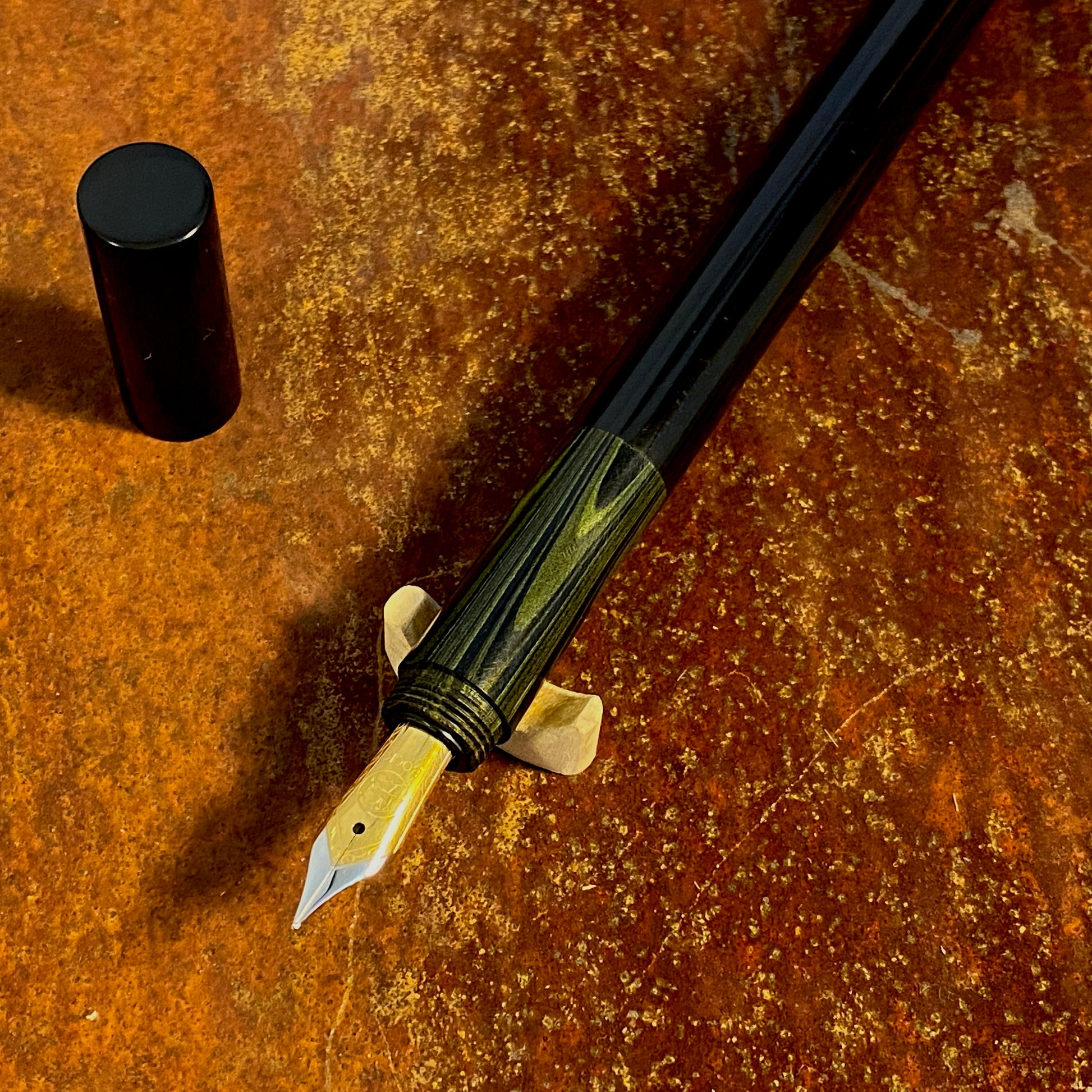漆黒のエボナイトなかに、黄緑の波模様のカラーエボナイトが引き立つ、首軸部分がむき出しになっているクラシックで新しいタイプの万年筆です。月夜と比べて、細くエレガントなバランスになっています。