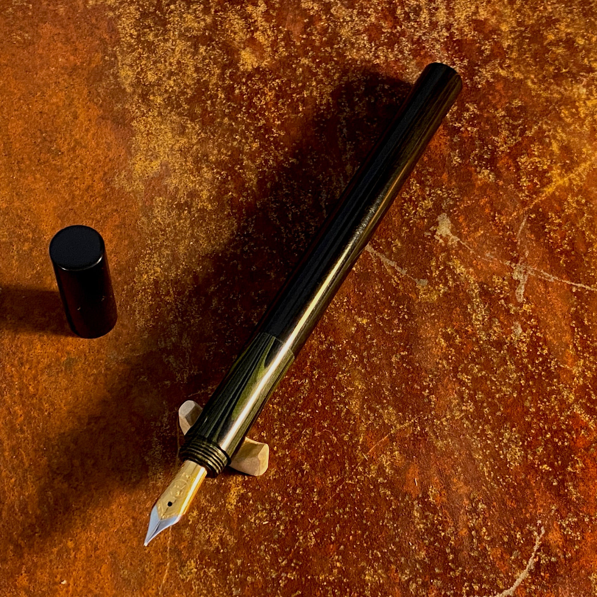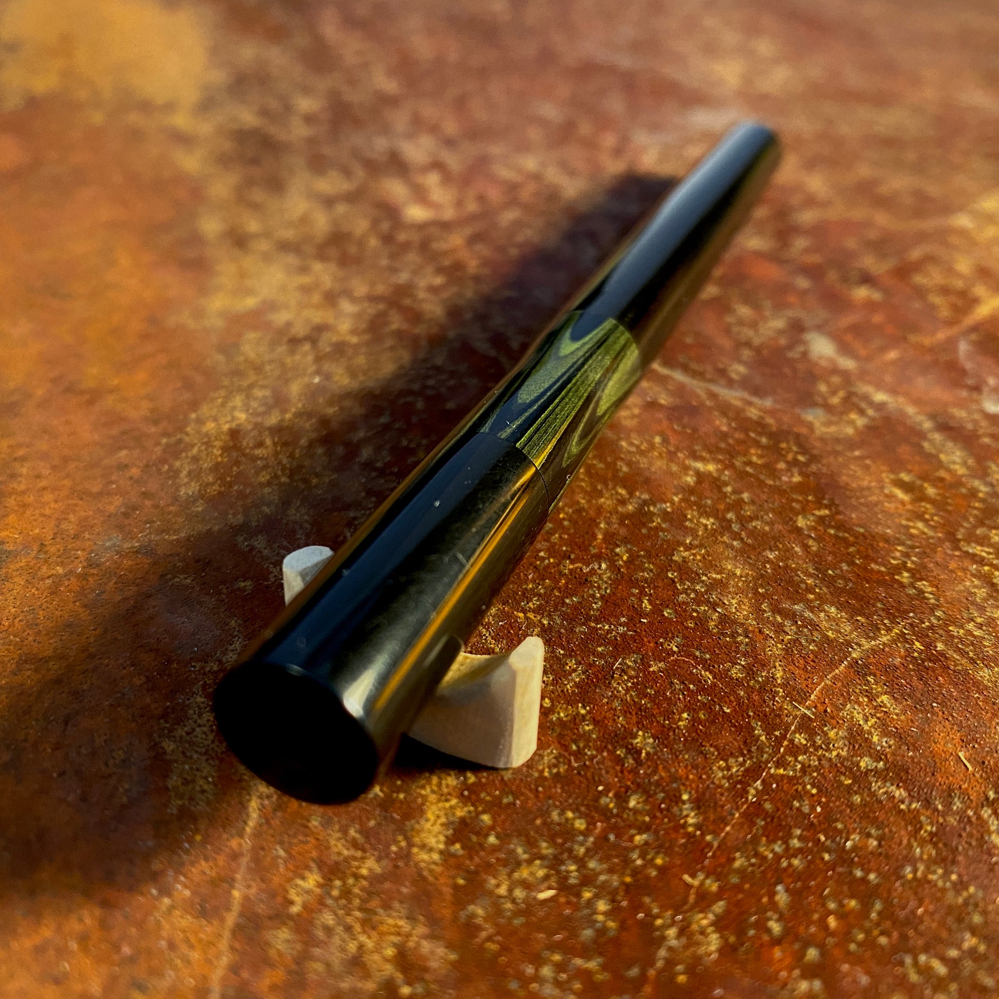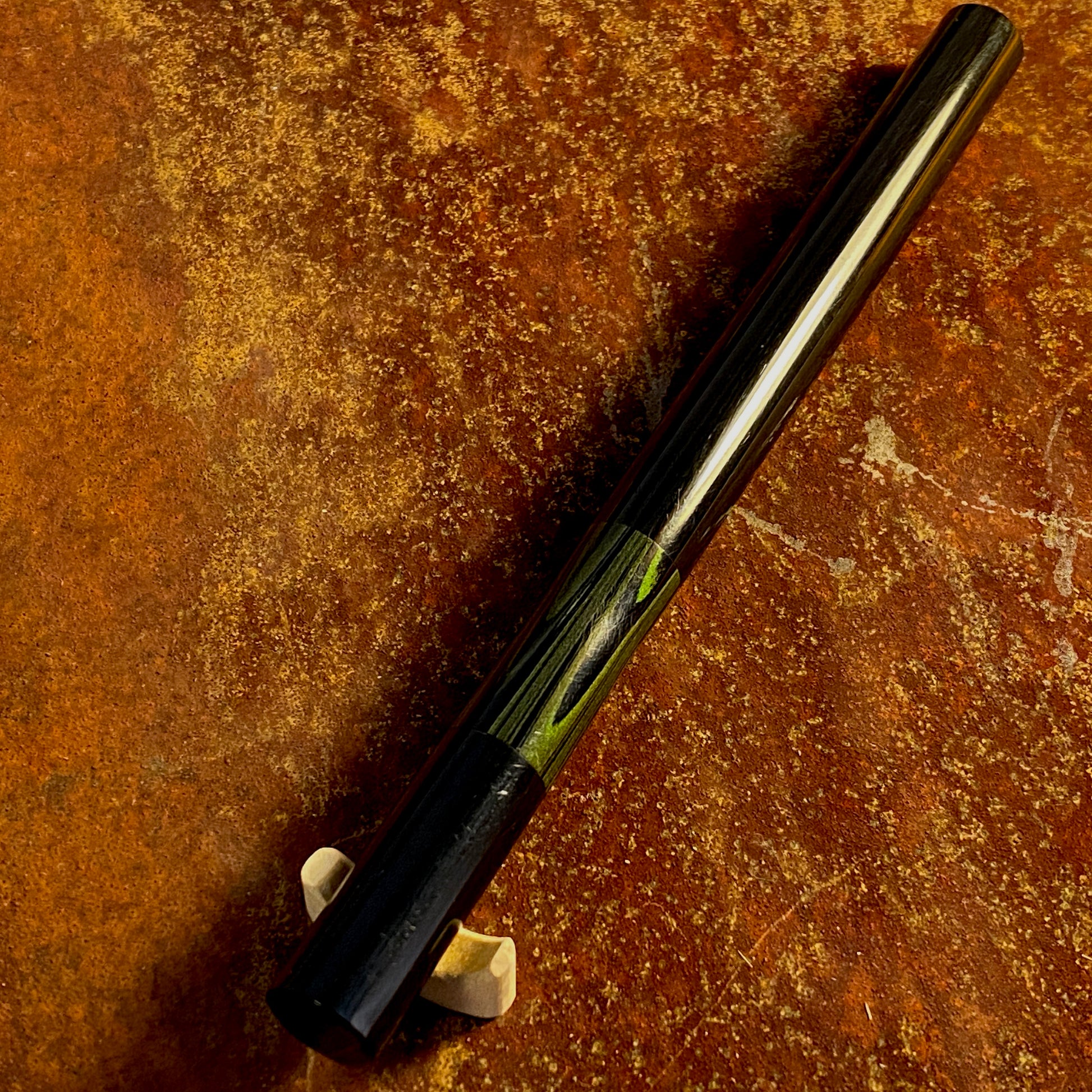 漆黒のエボナイトなかに、黄緑の波模様のカラーエボナイトが引き立つ、首軸部分がむき出しになっているクラシックで新しいタイプの万年筆です。月夜と比べて、細くエレガントなバランスになっています。