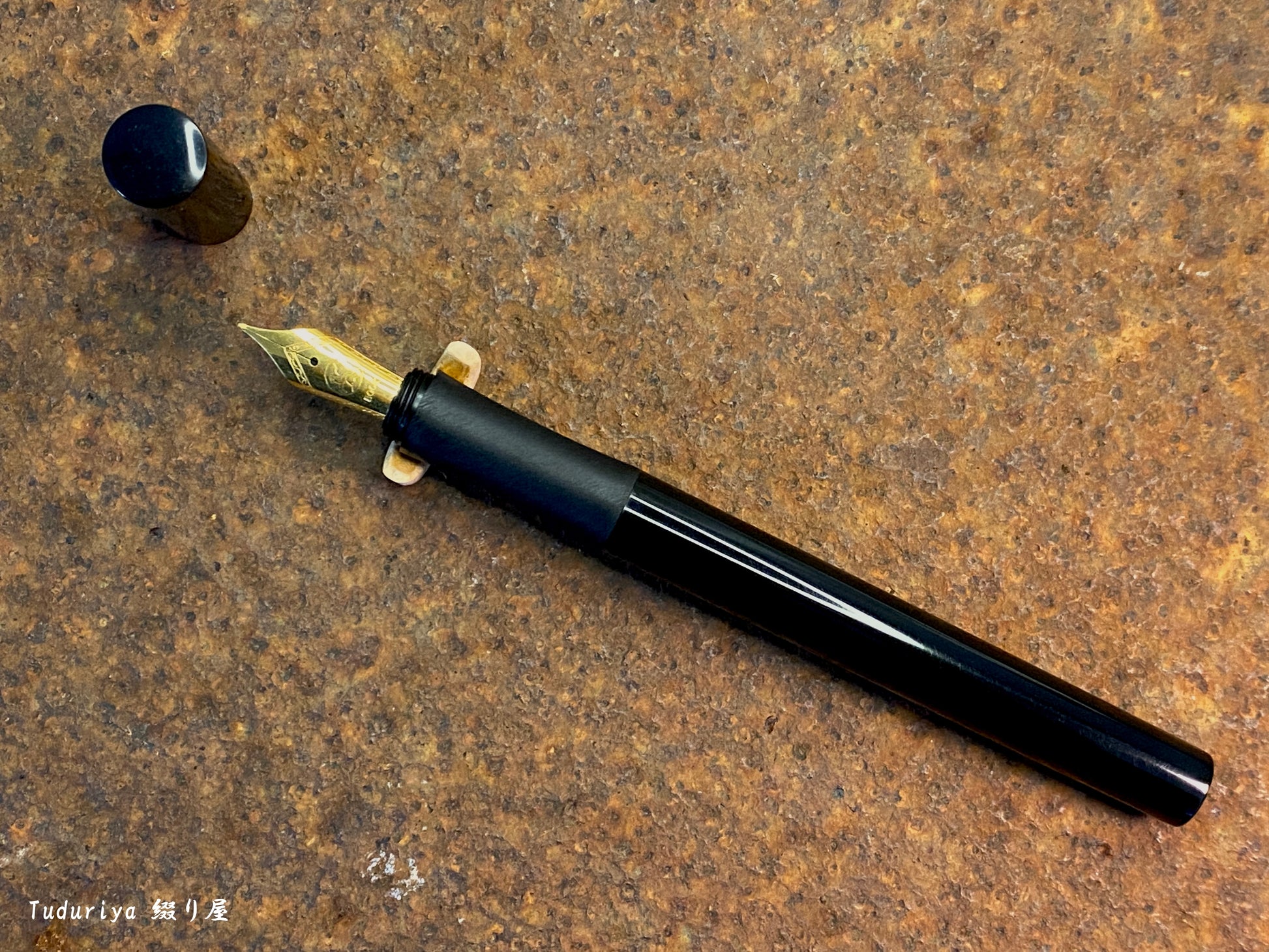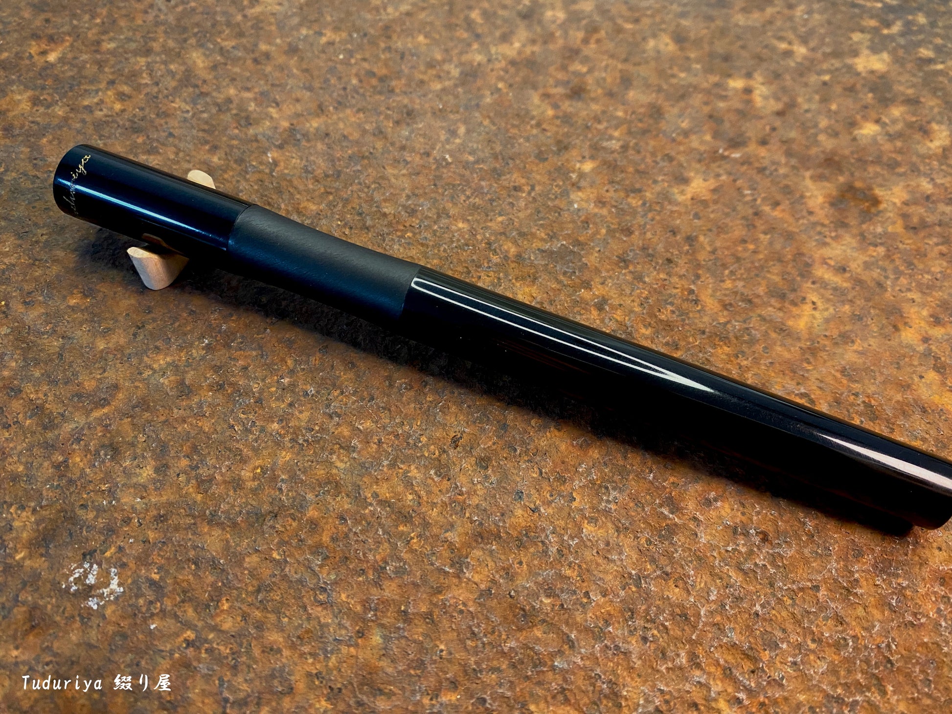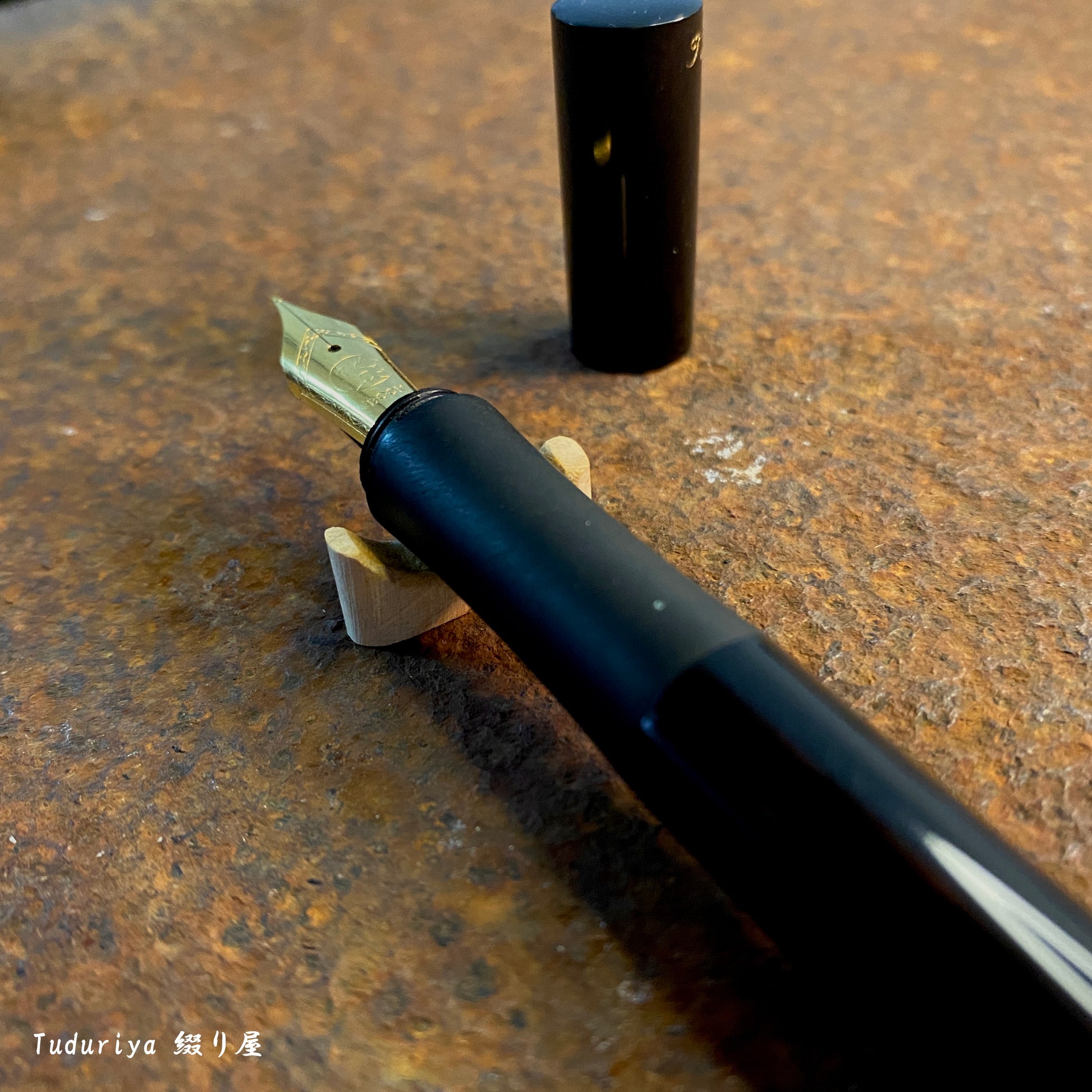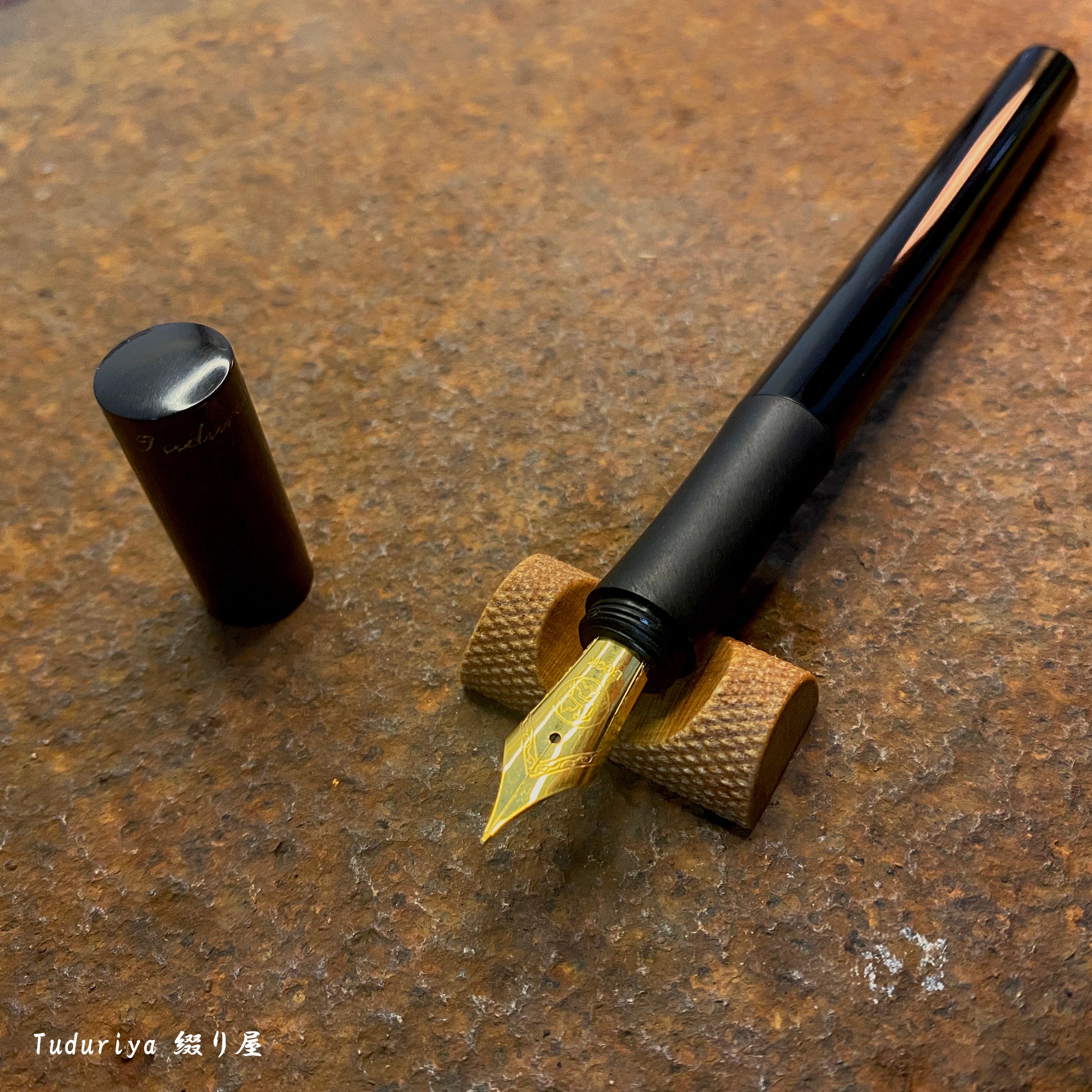 ブラックとブラックの陰影が落ち着いた印象を与える。首軸部分がむき出しになっているクラシックで新しいタイプの万年筆です。
