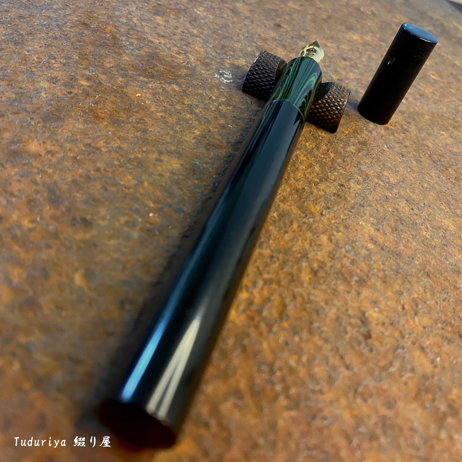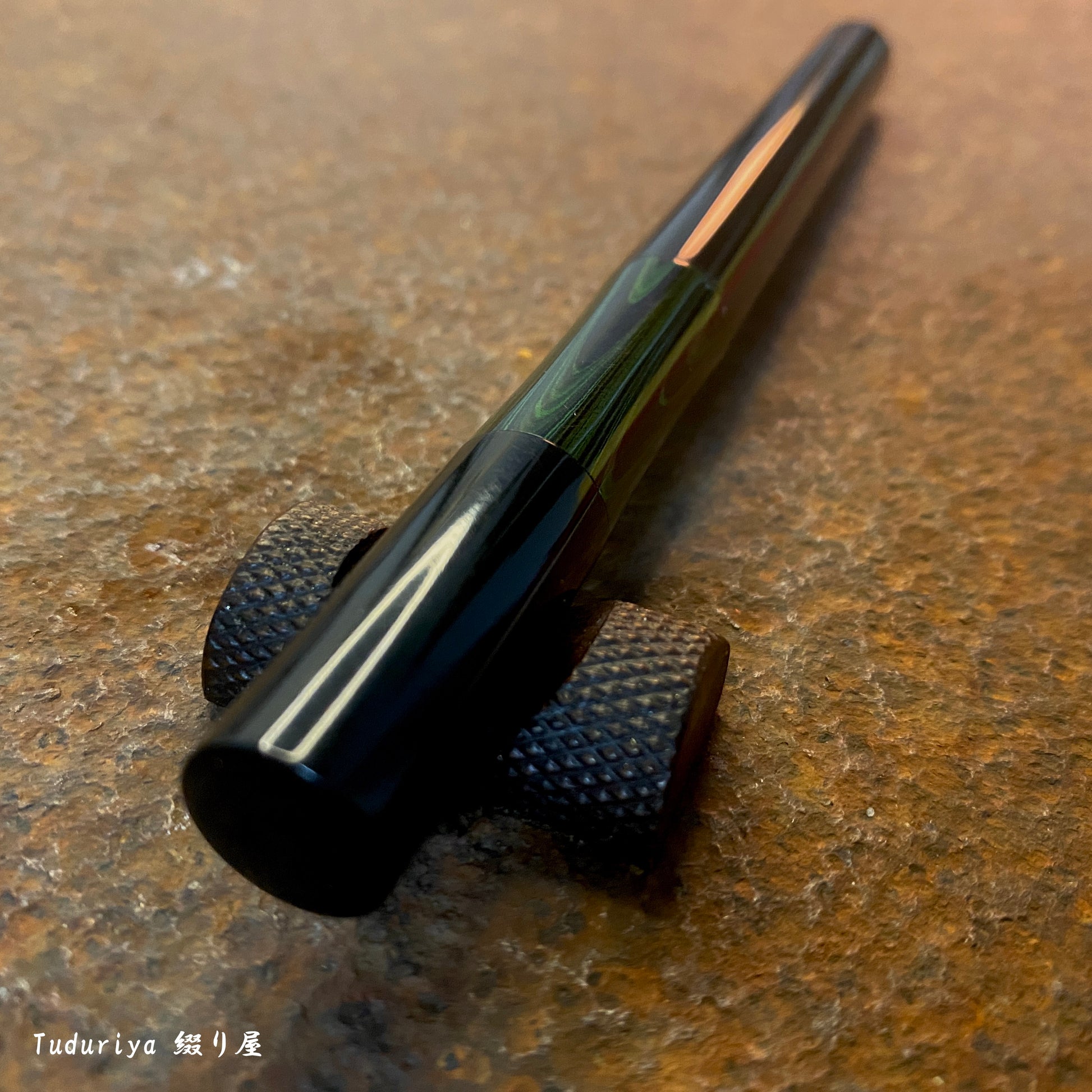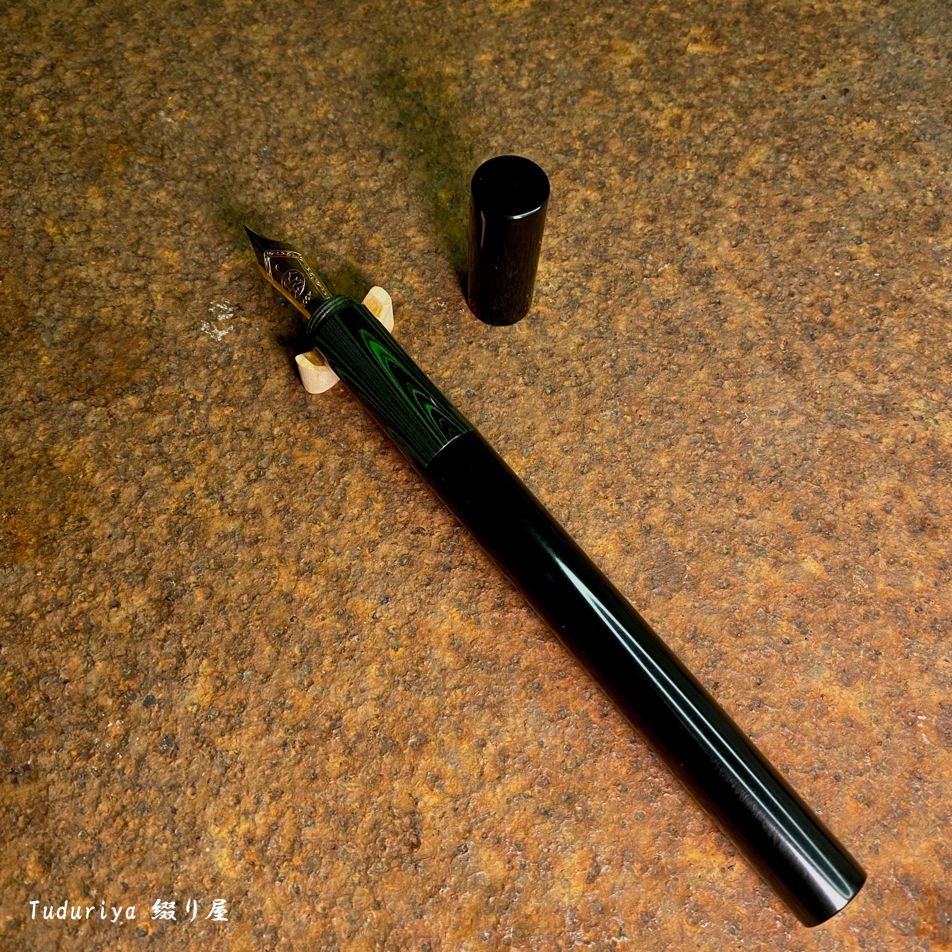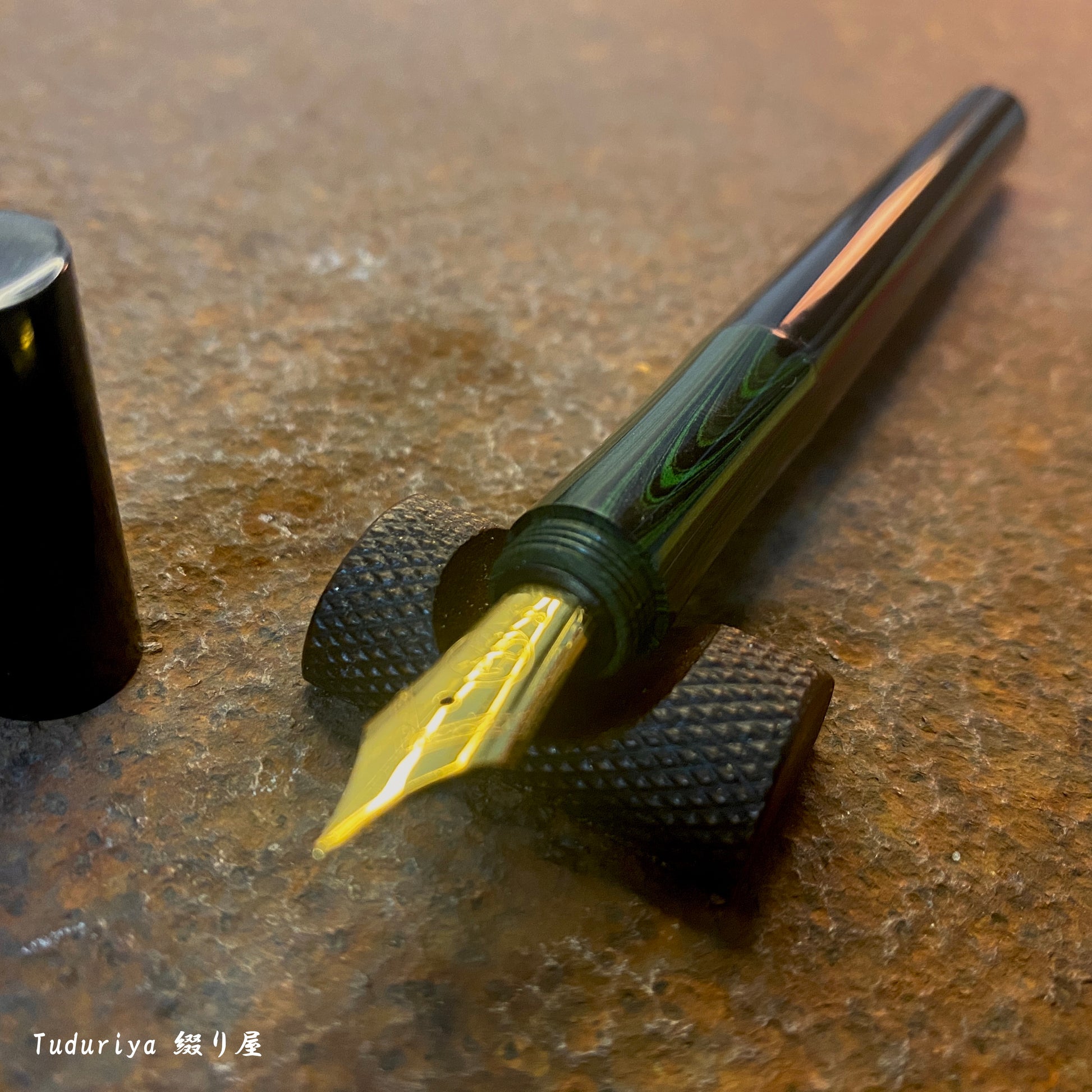 ブラックとグリーンの杢目の美しさが、漆黒に挟まれることにより引き立ちます。首軸部分がむき出しになっているクラシックで新しいタイプの万年筆です。首軸部分がむき出しになっているクラシックで新しいタイプの万年筆です。 首軸のわずかな窪みが、しっかりと手になじみ長い時間の筆記でも疲れを感じさせません。