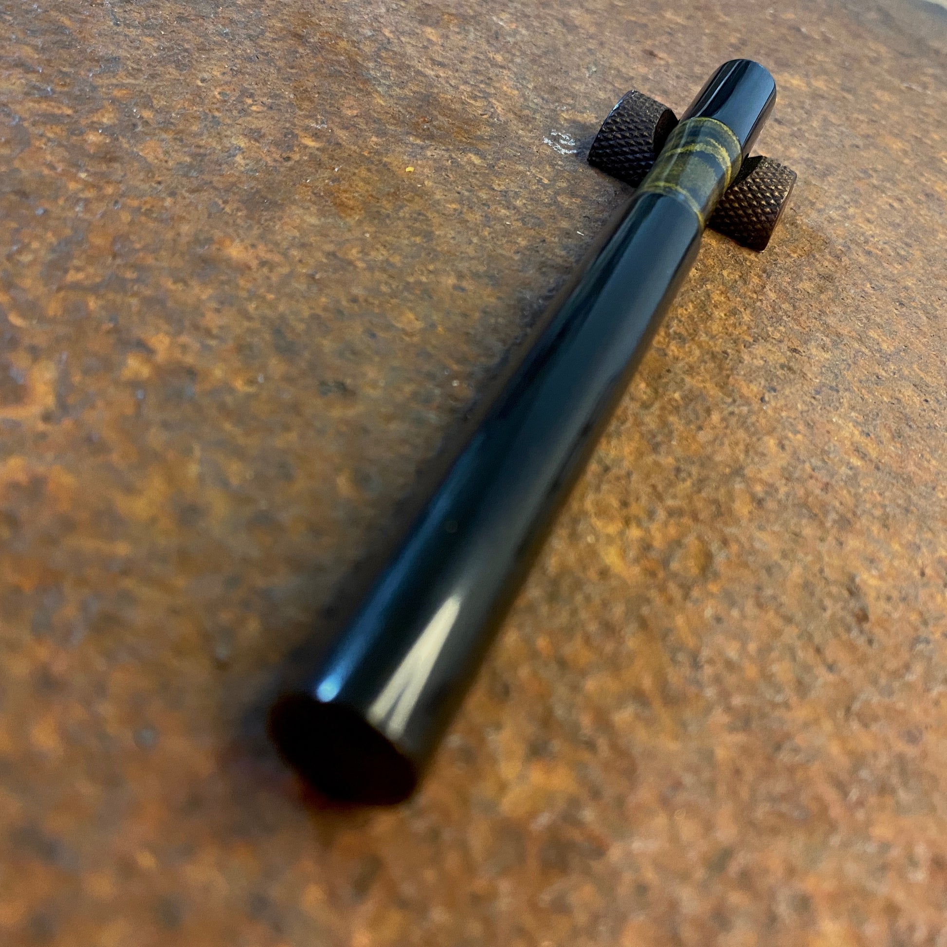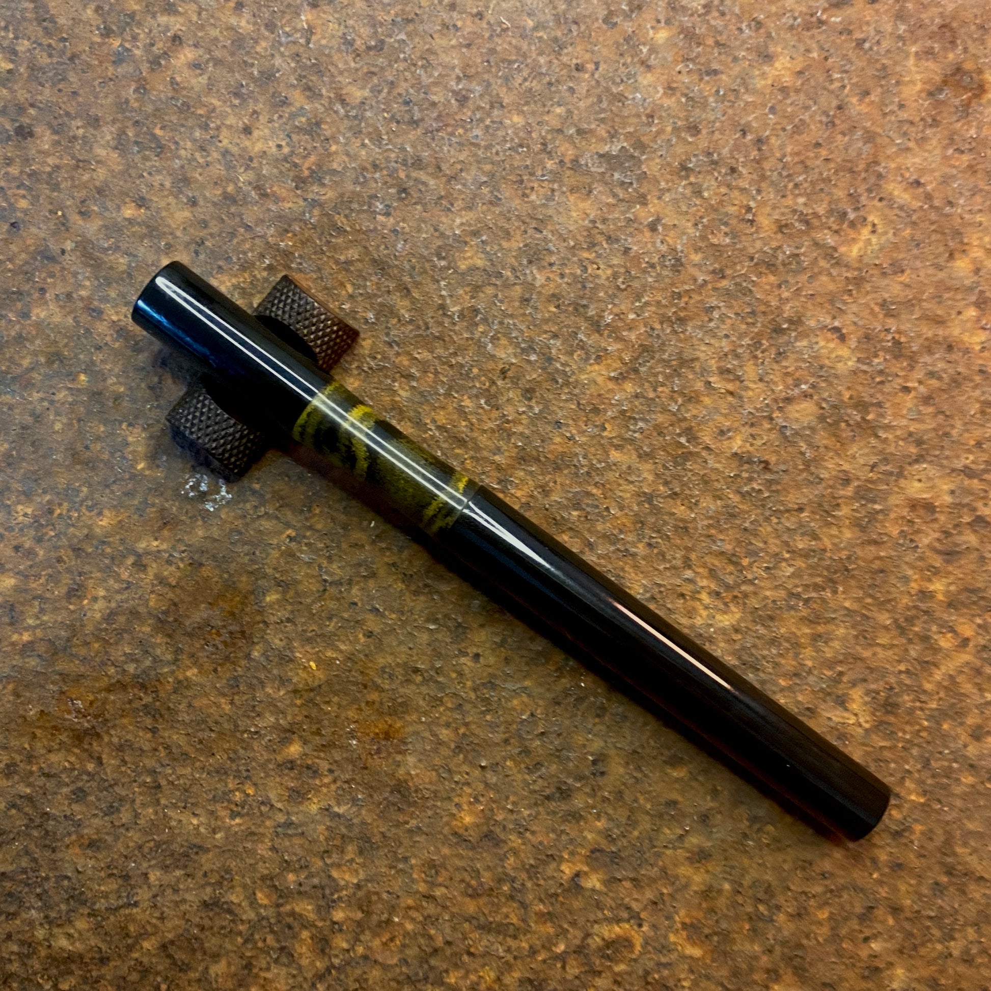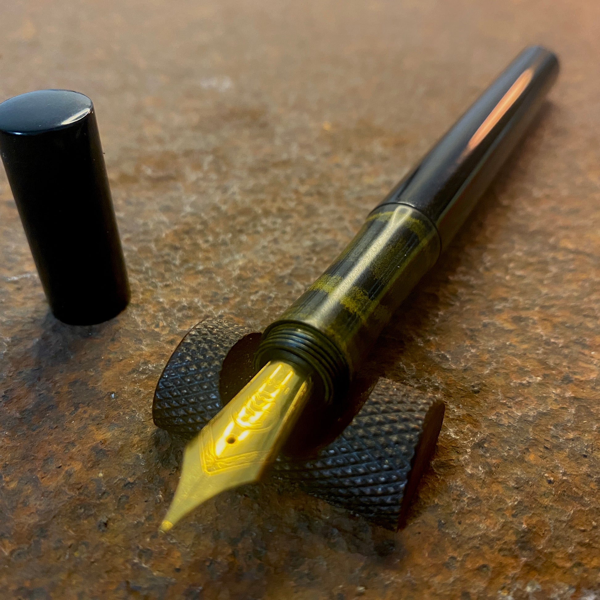 控えめなブラックとイエローの渦巻きが、虎の毛並みのように見えとても美しいです。その美しさは黒に挟まれて際立っています。首軸部分がむき出しになっているクラシックで新しいタイプの万年筆です。